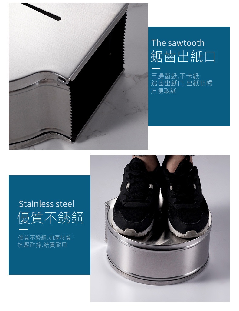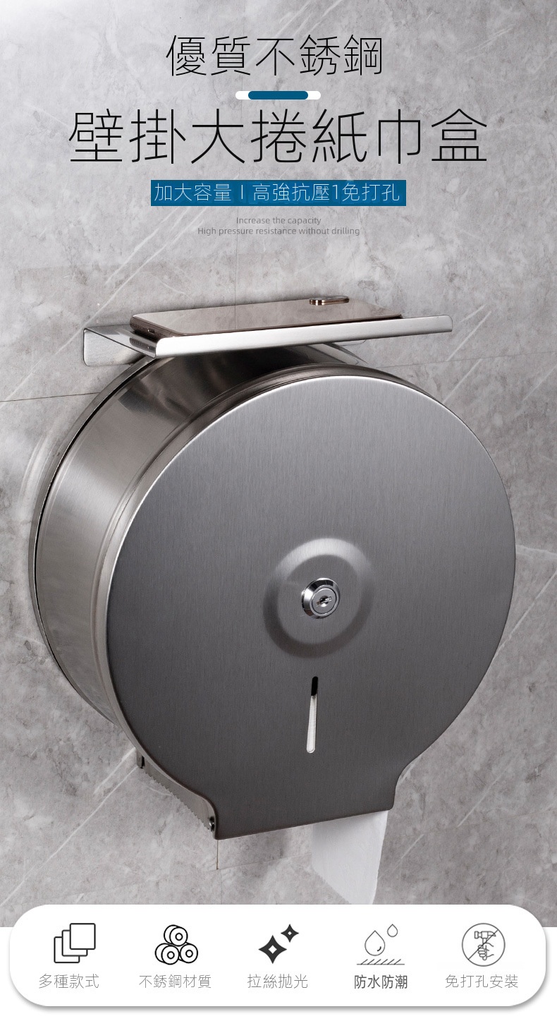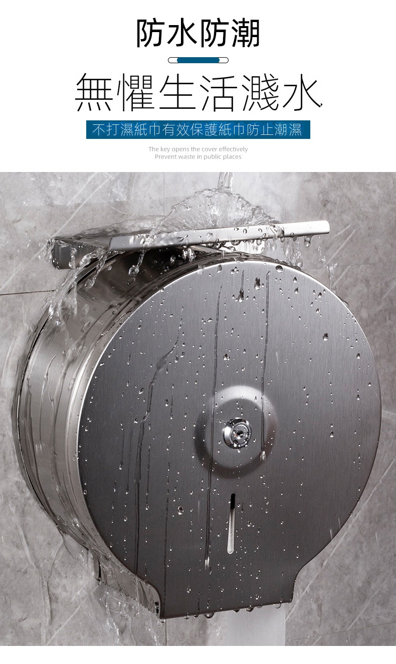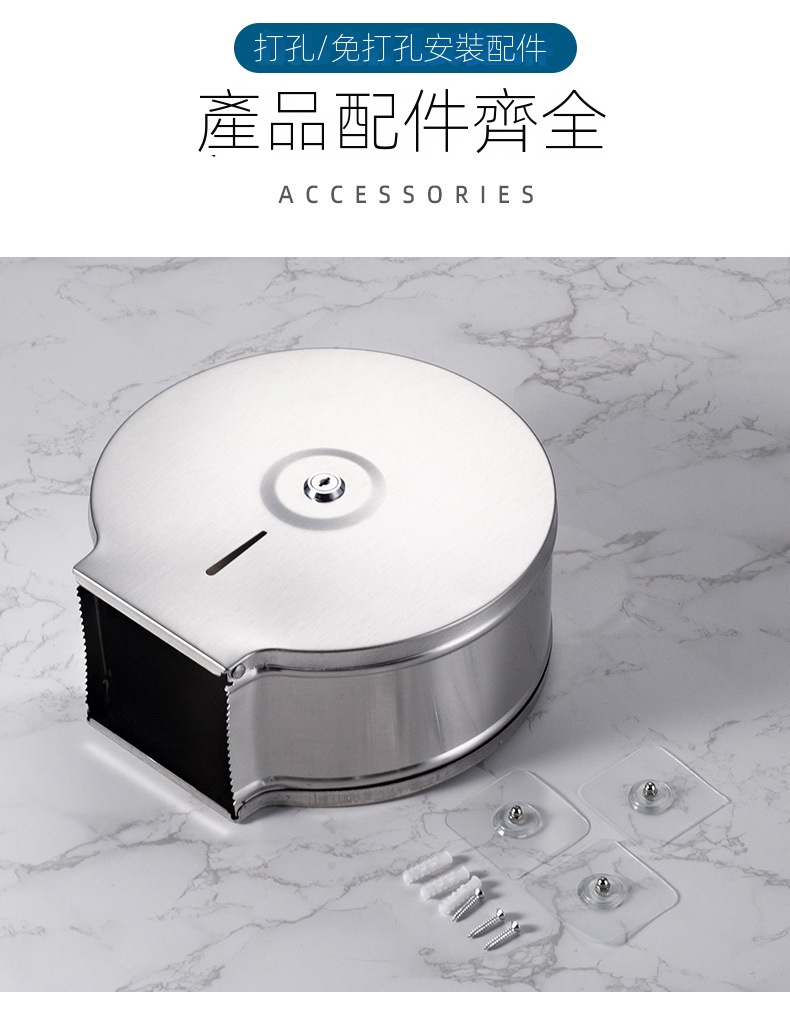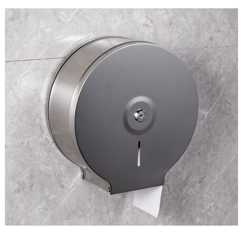 此款壁掛式不鏽鋼大卷衛生紙架,專為公共場所設計,配有鑰匙防盜開蓋,有效防止浪費,適合商場、寫字樓、醫院、學校等場景使用。它可以安裝於大理石、玻璃、金屬等多種牆面,同時可以免打孔安裝設計。內設可視窗方便觀察紙巾餘量,並具備鋸齒出紙口,確保出紙順暢不卡紙。客戶需要自行安裝產品。
