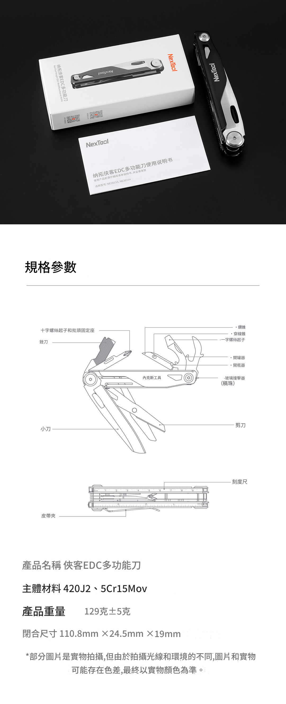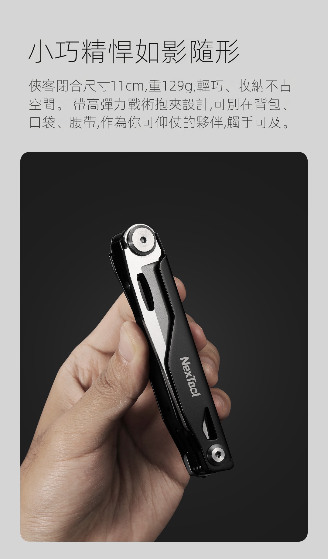 納拓俠客EDC多功能摺叠刀,集12種實用功能於一身,輕巧便攜,重僅129g,閉合長11cm,配有戰術抱夾設計,隨時隨地觸手可及。主刀採用5Cr15Mov不銹鋼,高硬度耐磨,搭配大尺寸剪刀、螺絲批、開罐器等多樣工具,適用於日常、戶外及探險場景。創新力學結構設計,開合順暢省力,多角度調整,適合狹窄空間操作。手柄經發黑處理,防銹耐潮,握感舒適。內建高強度陶瓷珠,危急時可擊碎車窗玻璃,保障安全。納拓俠客,讓你成為生活中的多面手,探索無限可能。