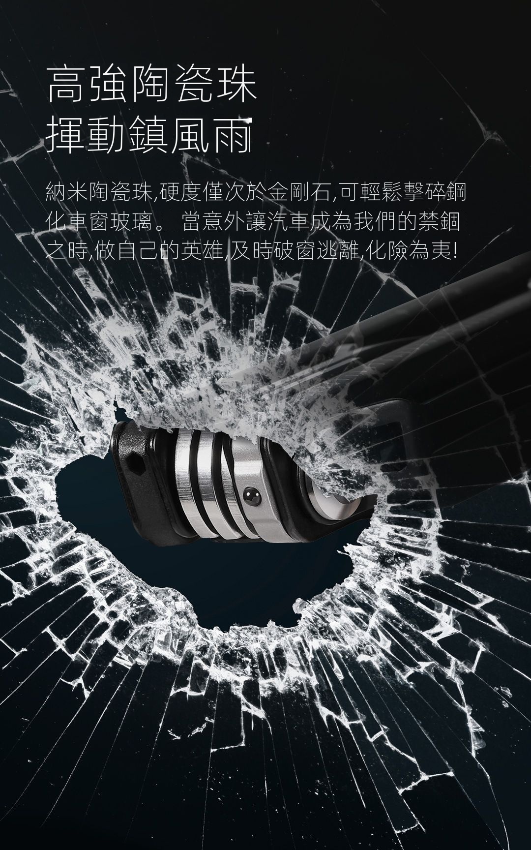 • 內置高強陶瓷珠,可用於擊碎鋼化車窗玻璃,應對緊急情況。