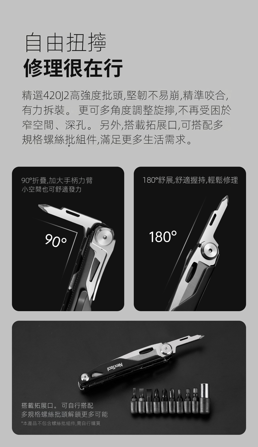 • 精選420J2高強度批頭,堅韌耐用,可多角度調整旋擰,適應窄空間和深孔操作。