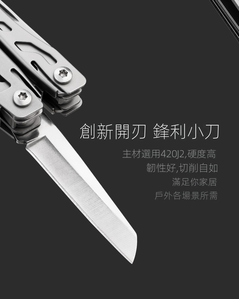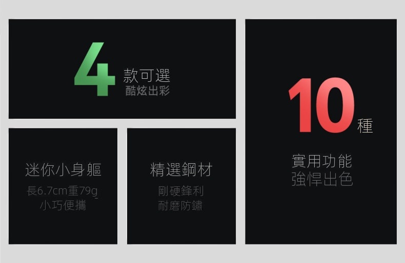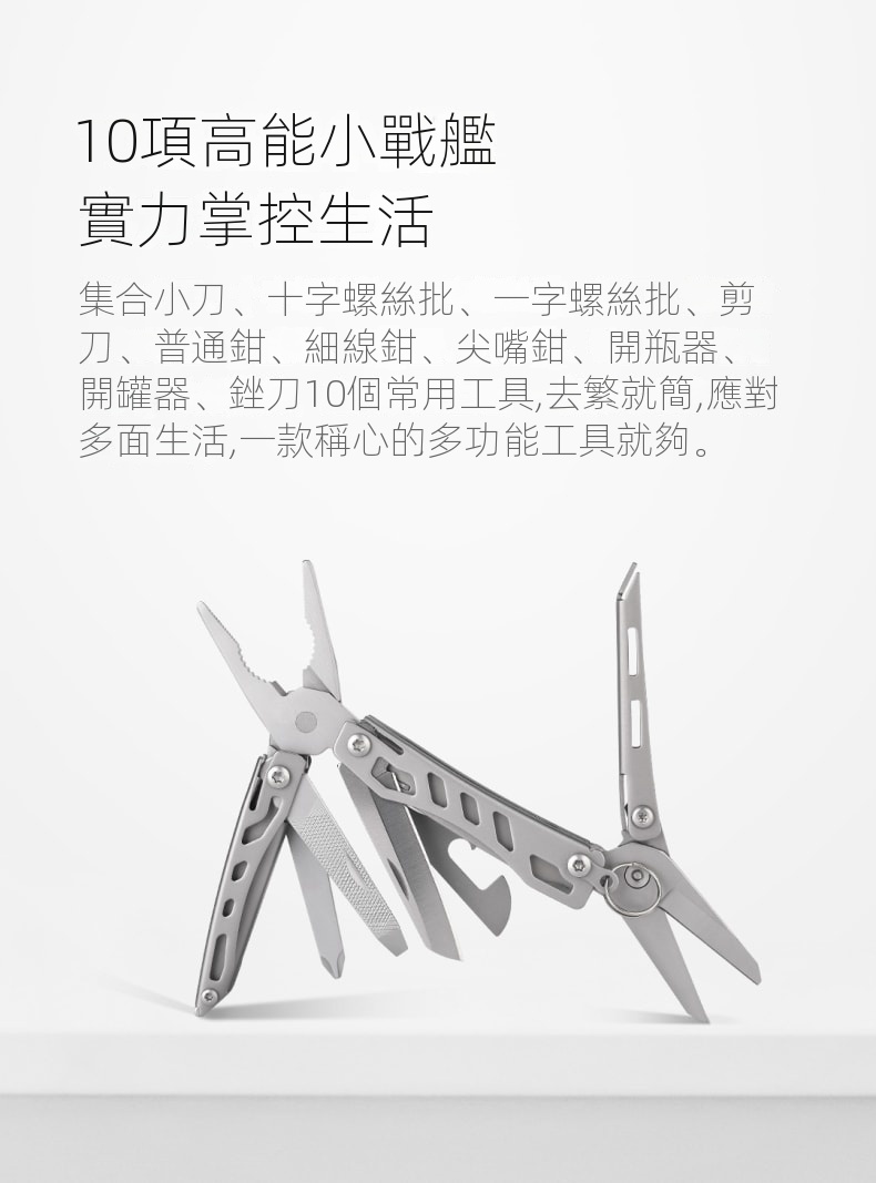 • 10項實用功能集於一身:小刀、十字螺絲批、一字螺絲批、剪刀、普通鉗、細線鉗、尖嘴鉗、開瓶器、開罐器、銼刀,應對多種生活場景。