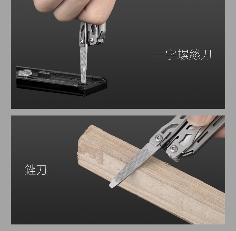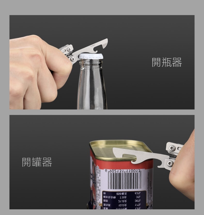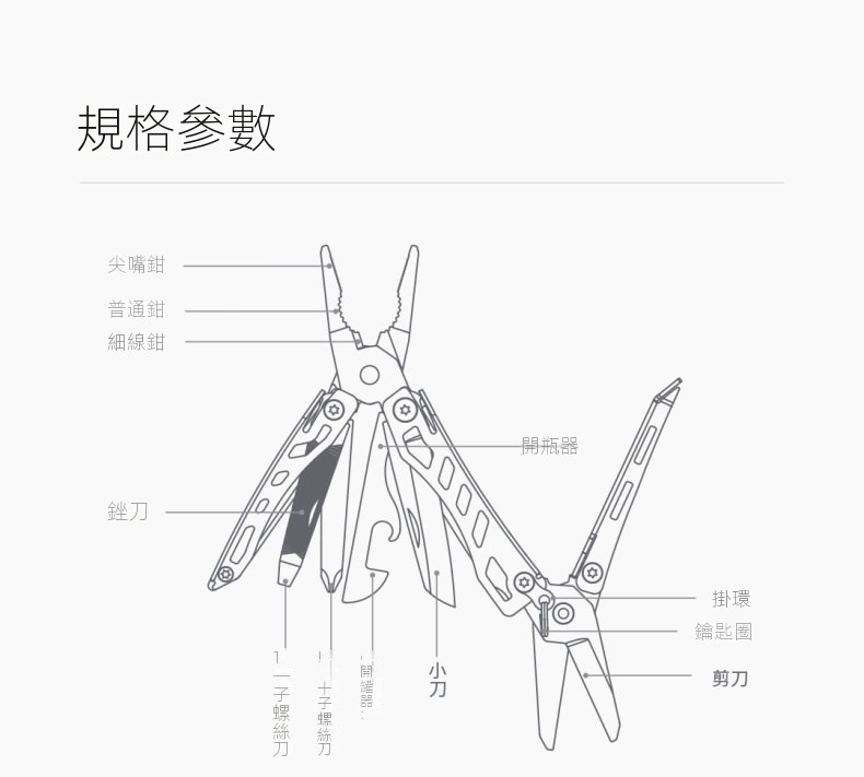 • 功能列表:小刀、十字螺絲批、一字螺絲批、剪刀、普通鉗、細線鉗、尖嘴鉗、開瓶器、開罐器、銼刀