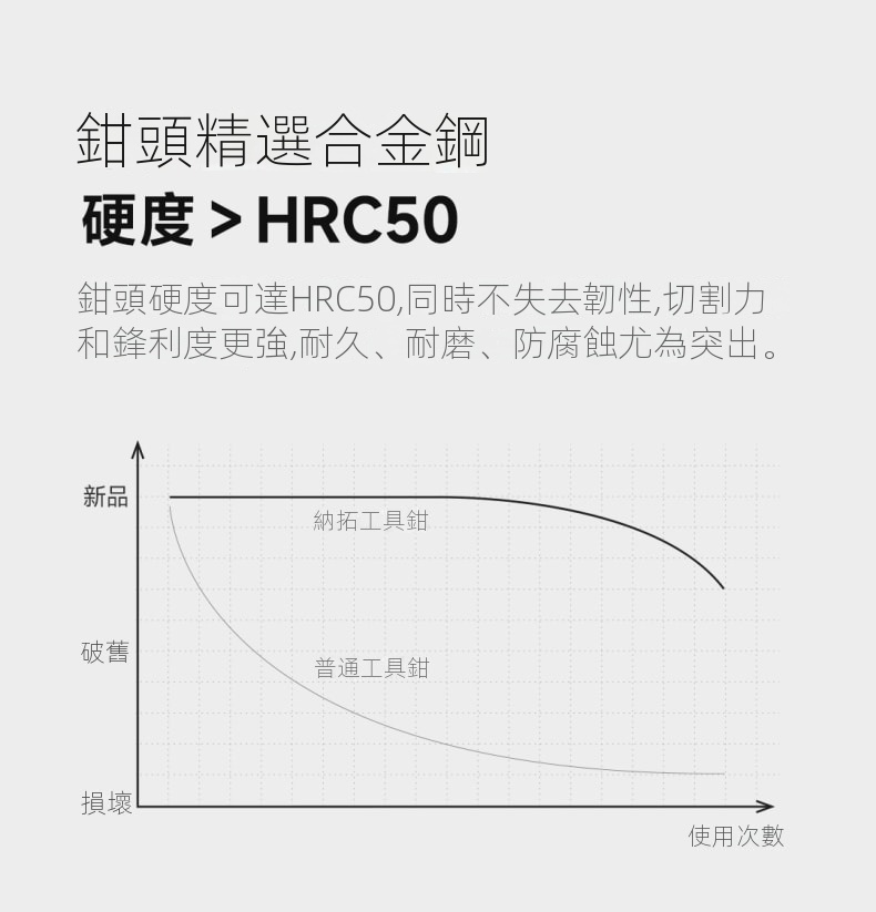 • 鉗頭採用合金鋼製成,硬度達HRC50,兼具韌性和鋒利度,耐久、耐磨、防腐蝕。