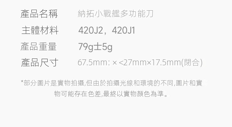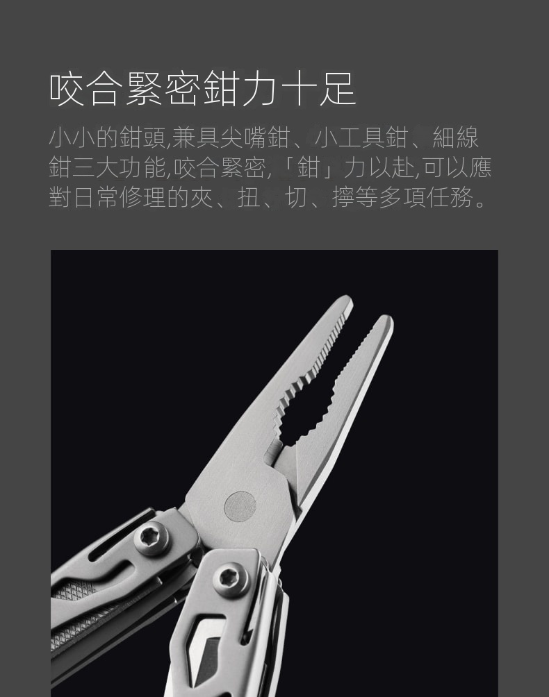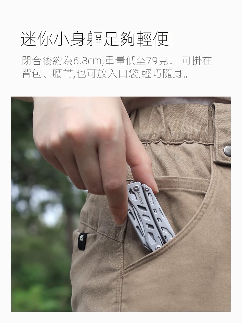 居家緊急、戶外探險,你是否總是在尋找一款趁手工具? Nextool納拓小戰艦多功能鉗,是你的最佳選擇!它身材小巧,尺寸僅110x40x21.5mm(閉合) ,重量245g±5g,卻蘊含巨大能量。高強度30cr13、420j1、420j2不鏽鋼材質打造,堅固耐用,無畏磨損。功能上更是強大到超乎想像!集尖嘴鉗、標準鉗、細線鉗、硬線鉗、粗線鉗五大功能於一身,夾、扭、切、擰樣樣精通。此外,一字批、十字批、開瓶器、開罐器、剝線器、割繩刀等小工具一應俱全,剪刀柄外側有7cm刻度尺,鉗腿底部還有奈米陶瓷珠破窗器。折疊狀態下,不等式設計搭配背夾,方便懸掛攜帶。無論是家庭日常維修,還是戶外露營、自駕遊,它都能輕鬆應對各種狀況,堪稱生活中的得力夥伴 !