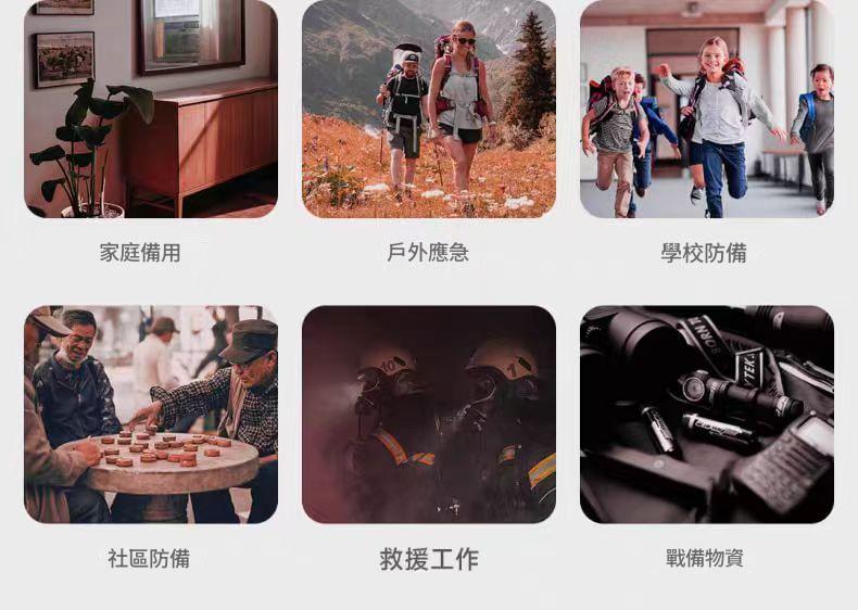 • 適用場景:家庭備用、戶外應急、學校防備、社區防備、戰備物資