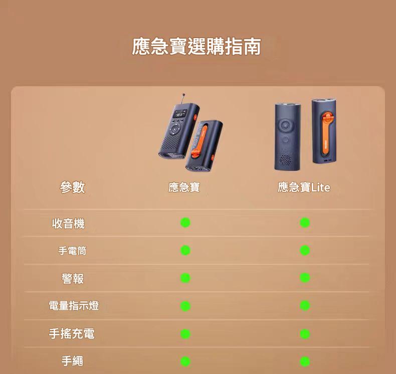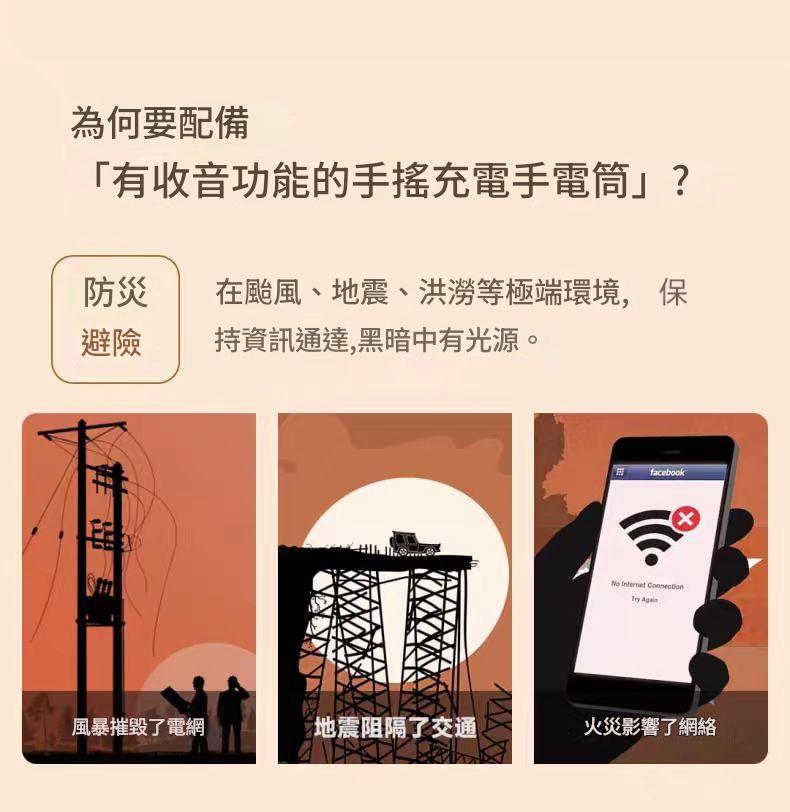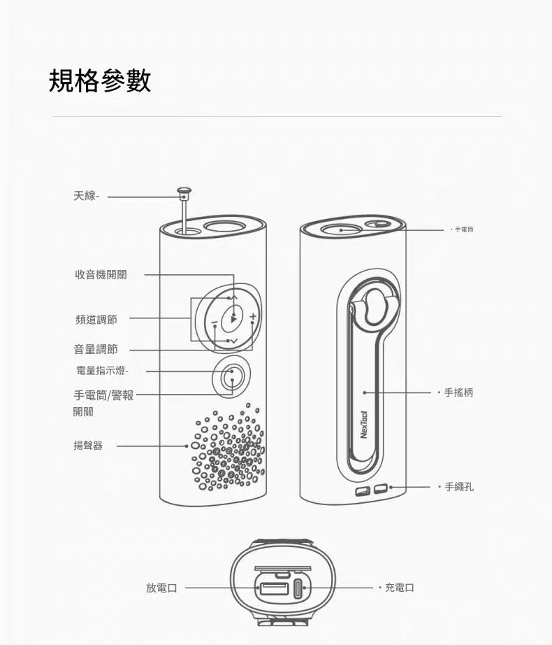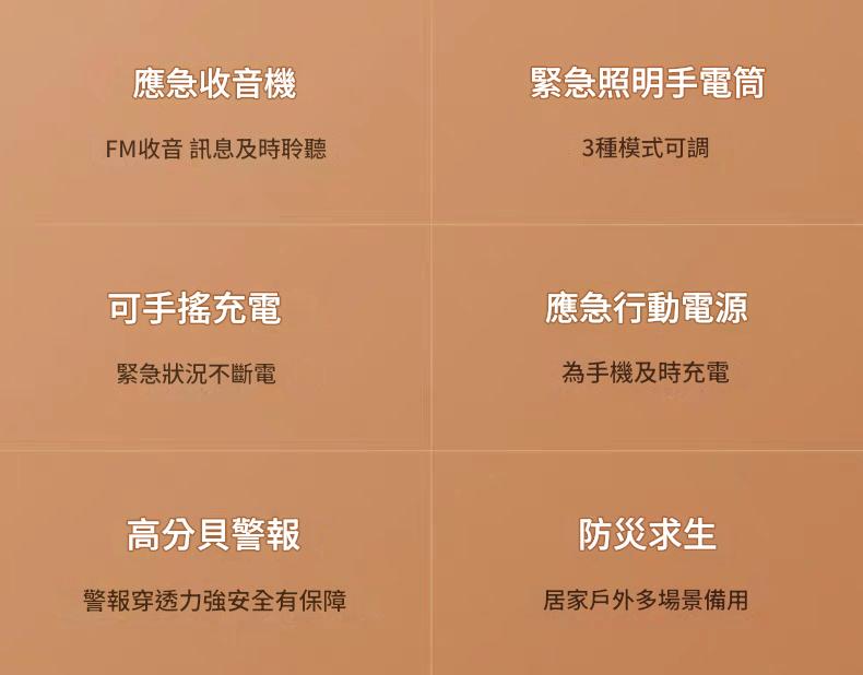 • 功能:收音機、手電筒、警報、電量指示燈、手搖充電、應急充電寶