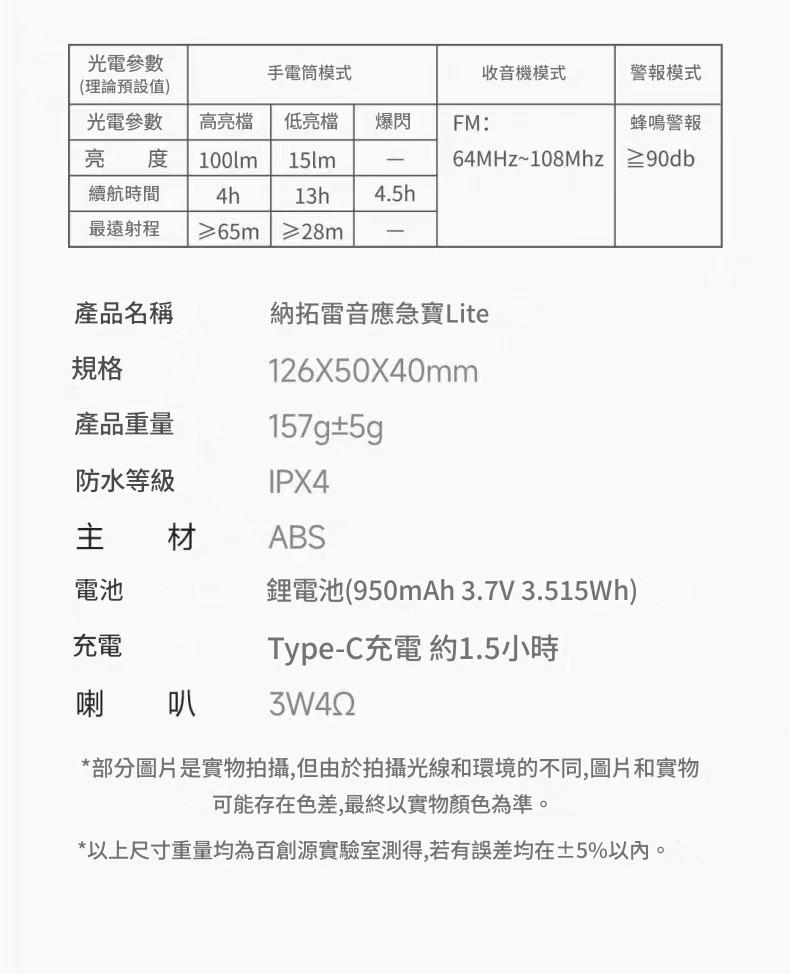 納拓雷音應急寶Lite,集收音機、手電筒、警報器及應急充電寶於一身,為您提供全方位的安全守護。內建FM收音功能,讓您在緊急時刻掌握最新資訊;高亮度LED燈具備三種模式,無論是日常使用或災難環境都能提供充足光源。手搖充電設計確保不斷電,隨時為手機補充能量。高分貝警報聲能有效求救,提升安全性。本產品通過嚴格品質檢測,內置950mAh鋰電池,配備過充保護,適合家庭、戶外等多場景使用,讓您在任何情況下都能安心無憂。