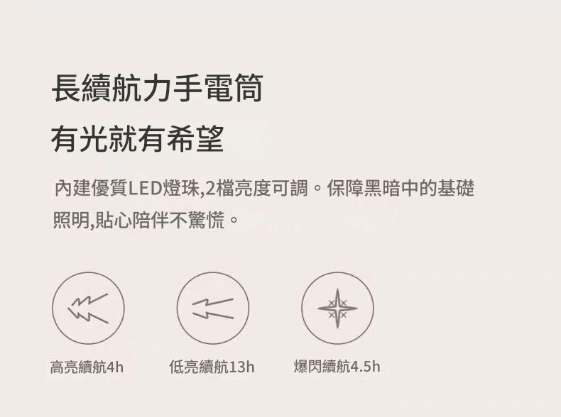• 手電筒模式:高亮續航4h,低亮續航13h,爆閃續航4.5h