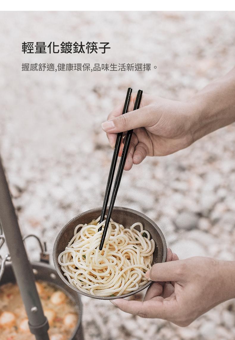 • 輕量化鍍鈦筷子,握感舒適且健康環保,適合戶外使用。