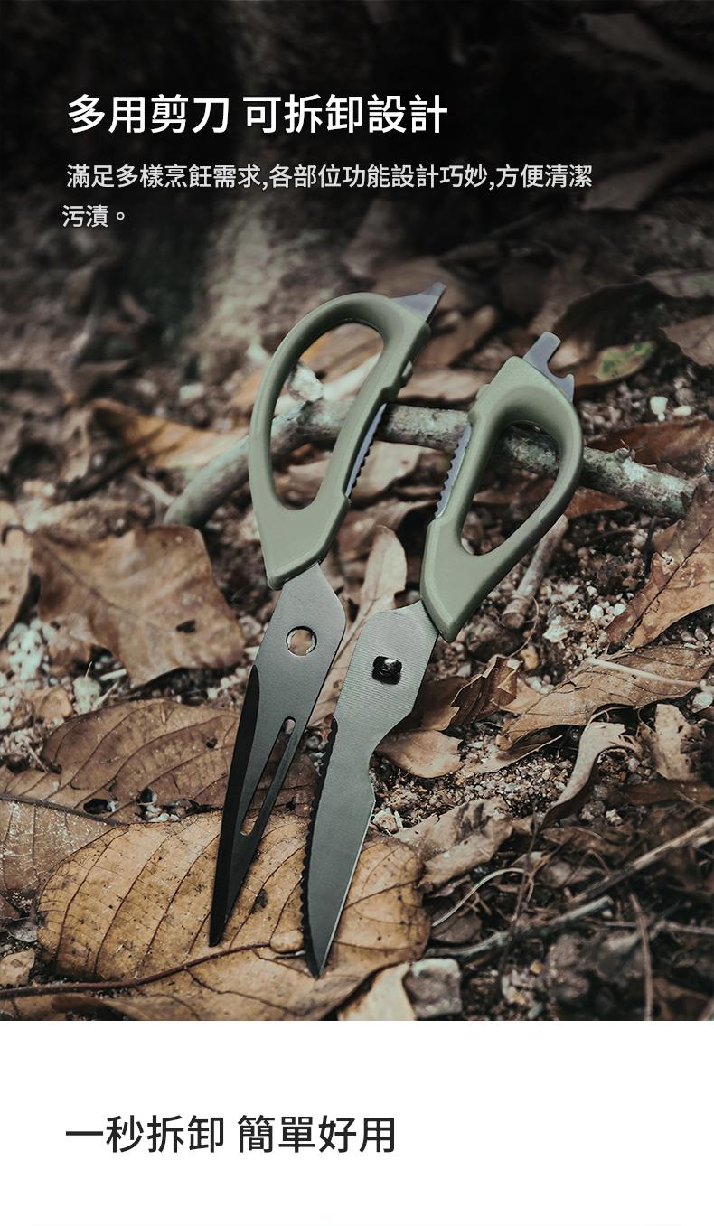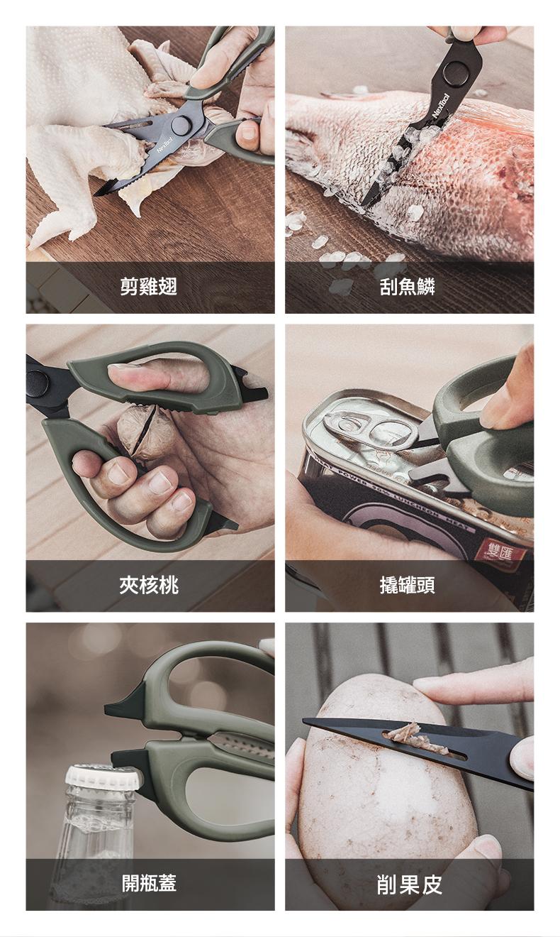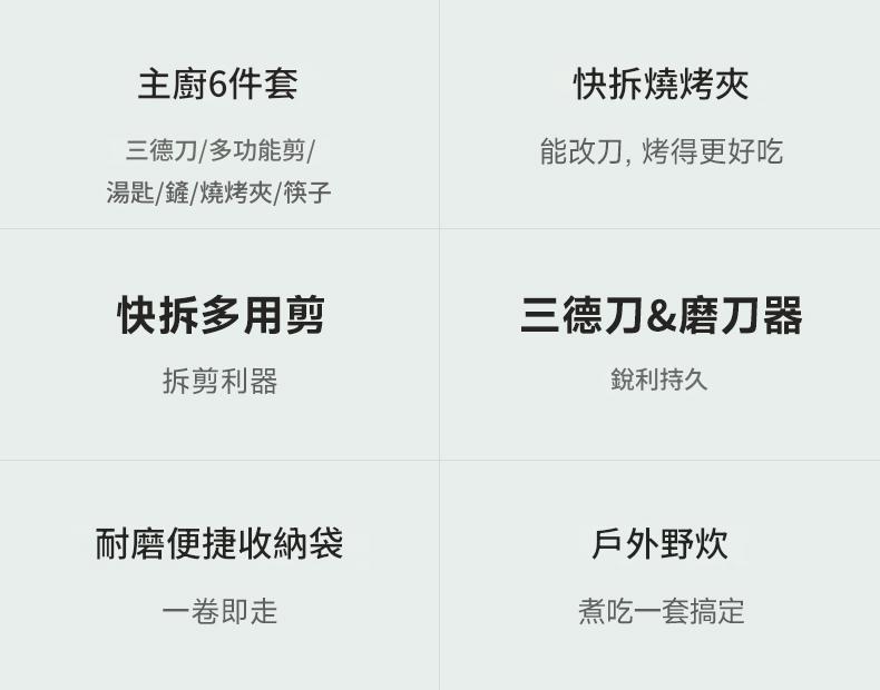 • Nextool 納拓戶外烹飪套裝,包含6件多功能廚具:多功能剪刀、多功能燒烤夾、鏟子、勺子、筷子、萬用刀。