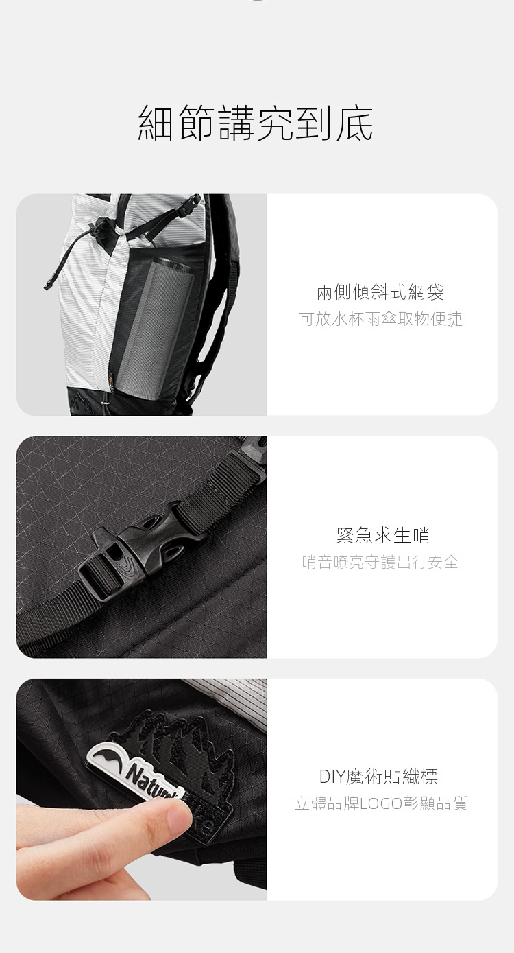 Naturehike輕量登山雙肩包,是熱愛戶外人士的理想選擇。其採用輕量化設計,減輕出行負擔,適合長途跋涉。大容量設計,滿足多日戶外探險需求,主倉能裝衣物、睡袋等,還有多個分隔層,方便分類收納。它具備優秀的背負系統,貼合人體背部曲線,有效分散重量,減少肩膀、背部壓力。優質布料打造,耐磨抗撕裂,防水性能佳,應對多變戶外天氣。兩側大網袋方便放置水壺等,多處外掛綁帶可固定登山杖等裝備。無論是登山、健行或露營,都能陪伴你輕鬆出遊 。