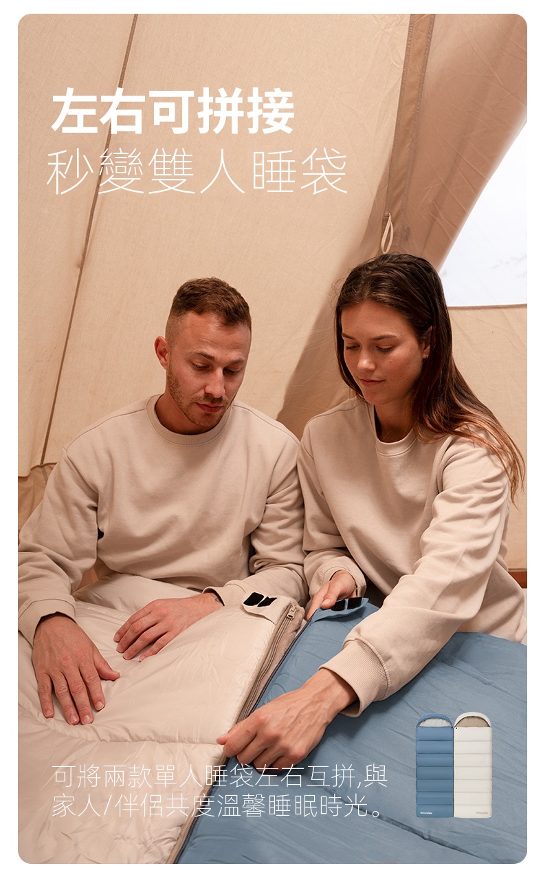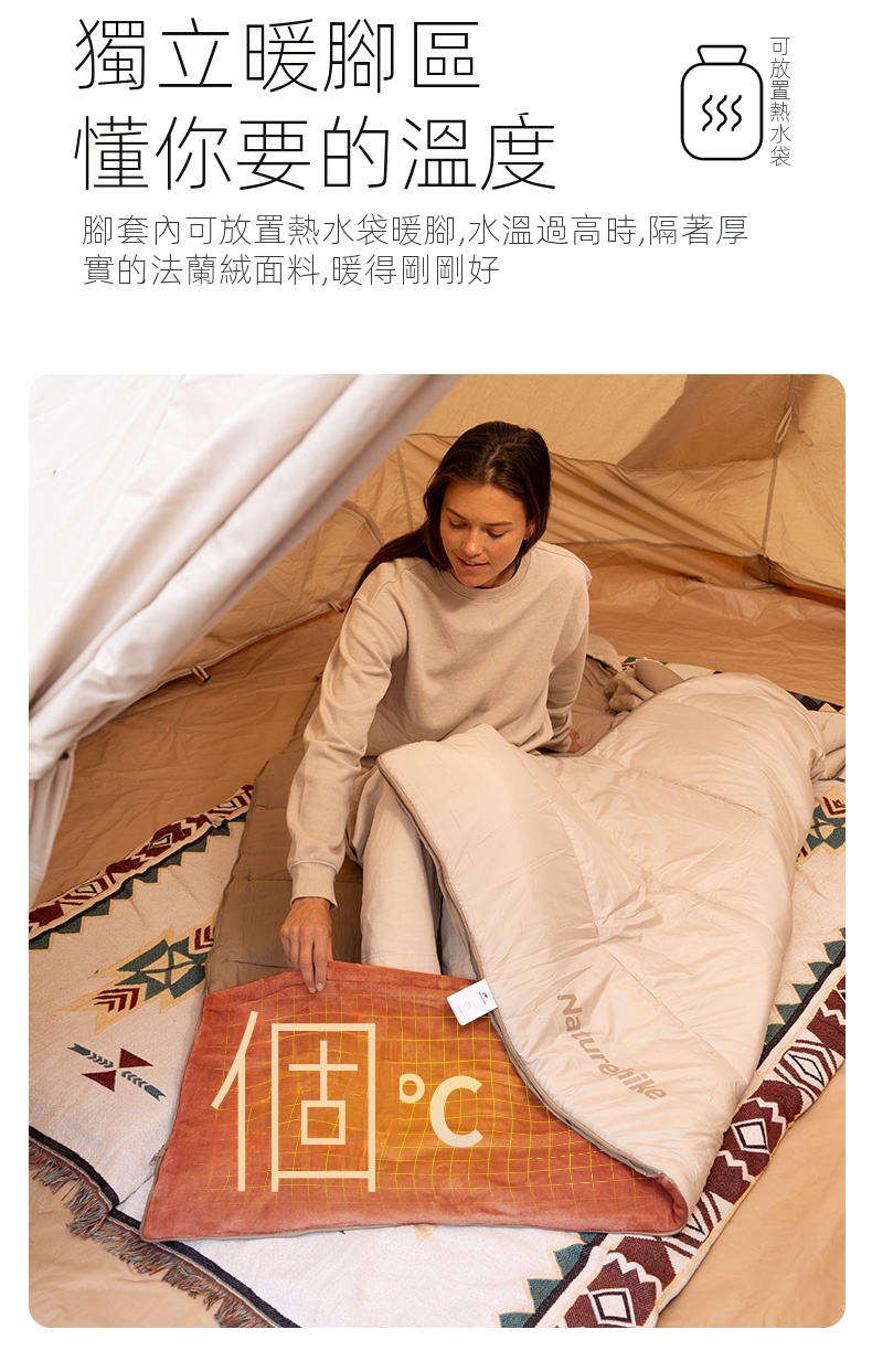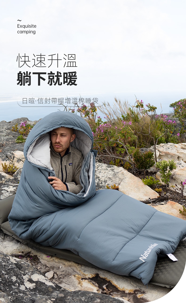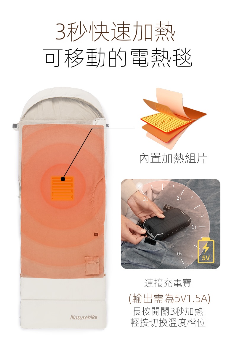 Naturehike信封式溫控棉睡袋,具備快速升溫功能,內建可拆卸法蘭絨夾層及電熱組片,連接充電寶後3秒即可加熱,提供三檔溫控調節(60°C、45°C、30°C),滿足不同需求。睡袋採用210T春亞紡面料與定型中空棉填充,輕盈保暖,適合戶外露營、居家午休等多場景使用。特殊設計的披肩和獨立暖腳區,讓秋冬不再凍手凍腳。此外,兩款單人睡袋還可拼接成雙人睡袋,增添親密感。產品通過遠紅外線發熱測試,具備保健功效,並通過CE認證,安全可靠。