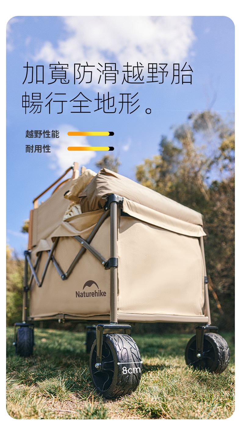 Naturehike 輕盈 可折疊露營車,是戶外出遊的得力助手。它擁有寬敞的內部空間,可輕鬆容納各類露營裝備,滿足多樣化裝載需求。採用高品質材料製作,結構穩固,具備優異的耐用性與承重。其越野車輪設計,能在沙地、草地等多種複雜地形暢行無阻。同時,它支援便捷折疊,方便收納與攜帶,無論是露營、野餐或日常使用,都十分實用。