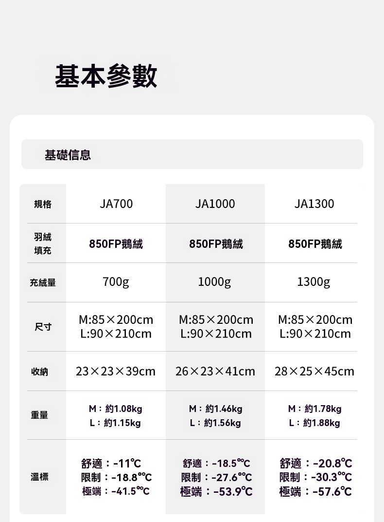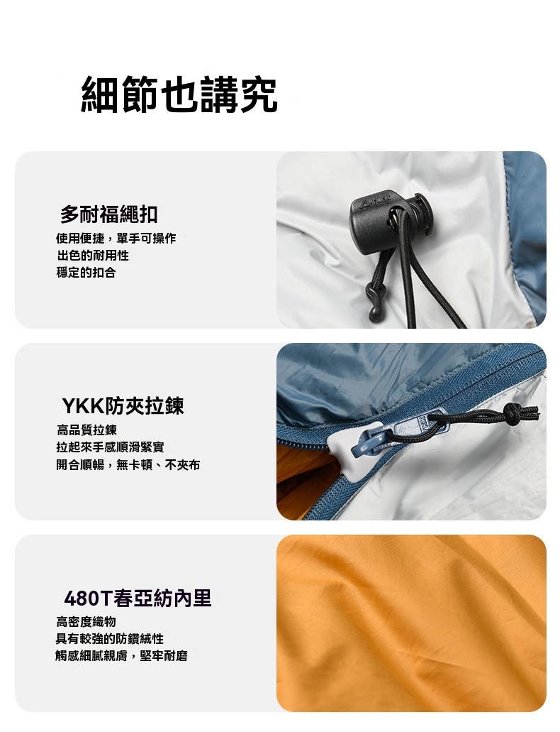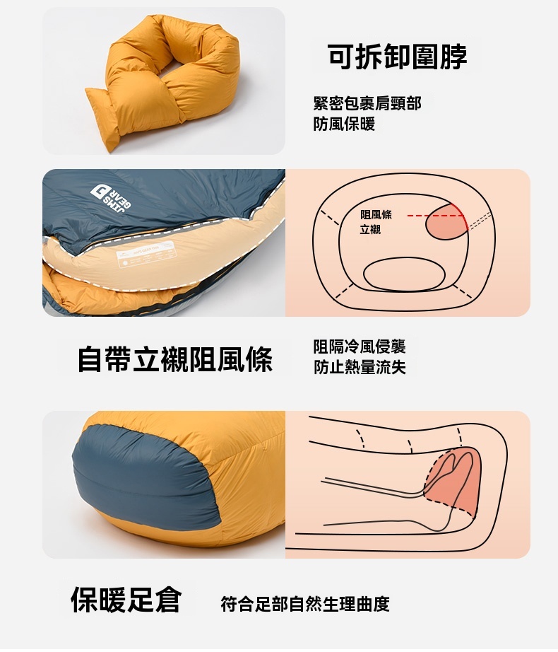 Naturehike J 系列木乃伊羽絨睡袋,是戶外露營的理想選擇。它填充 850FP鵝絨,保暖性能卓越,能輕鬆抵禦低溫。上寬下窄的木乃伊包裹設計,可牢固鎖住溫度,減少熱量流失。其透氣防潑水尼龍外料,無懼突發狀況。獨特 C 型包裹與 U 型脖領設計,貼合人體結構,加厚阻風條防止拉鍊處漏風,為你帶來溫暖舒適的睡眠體驗 。