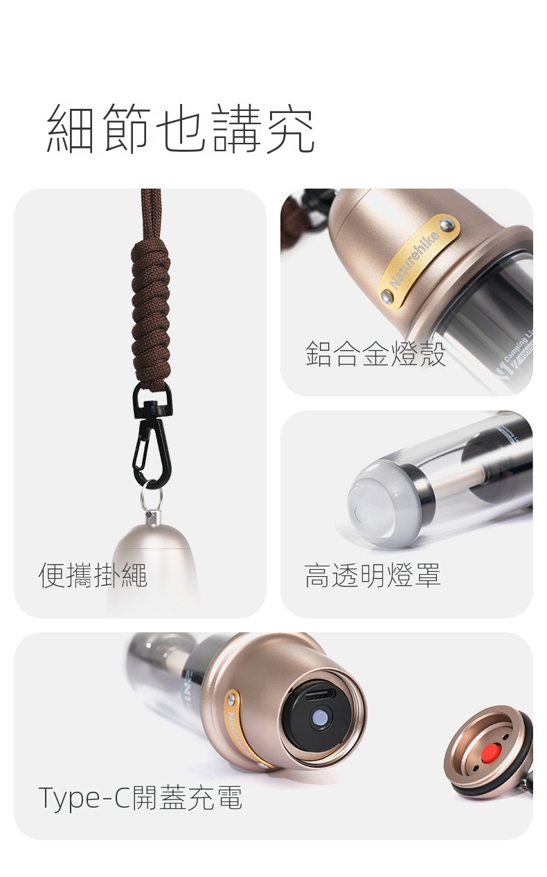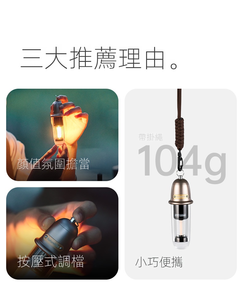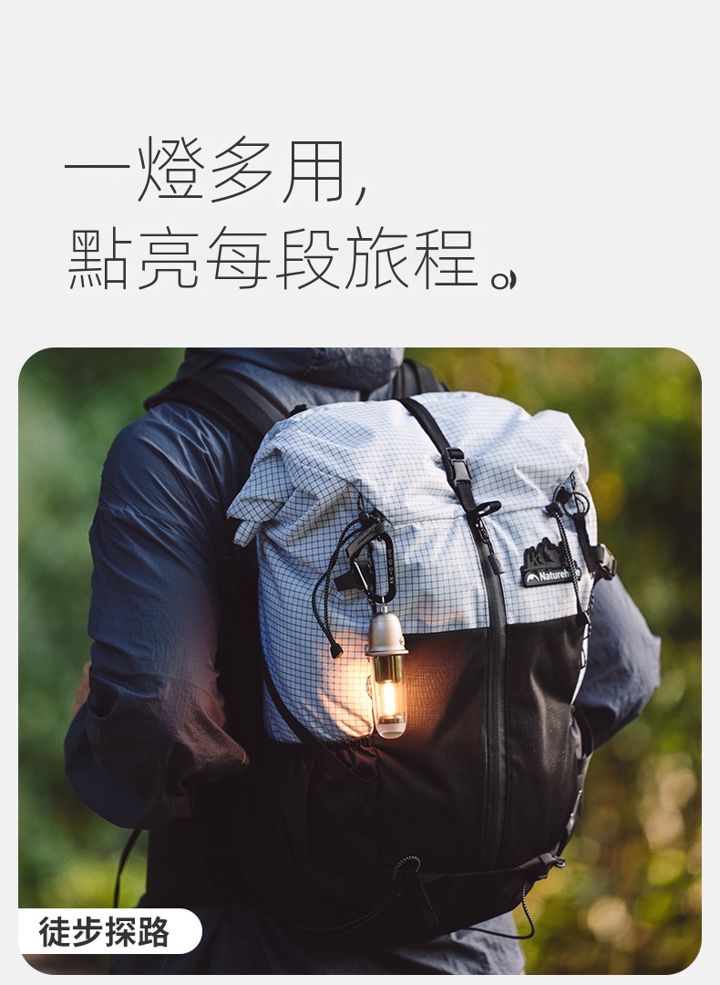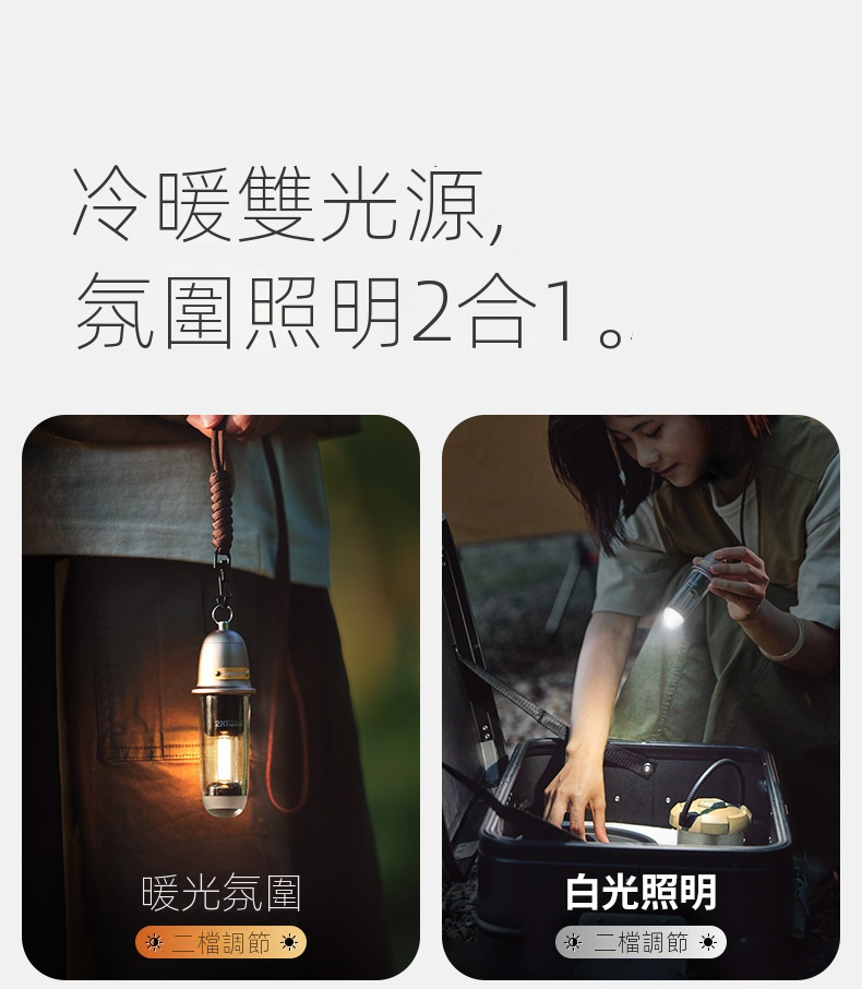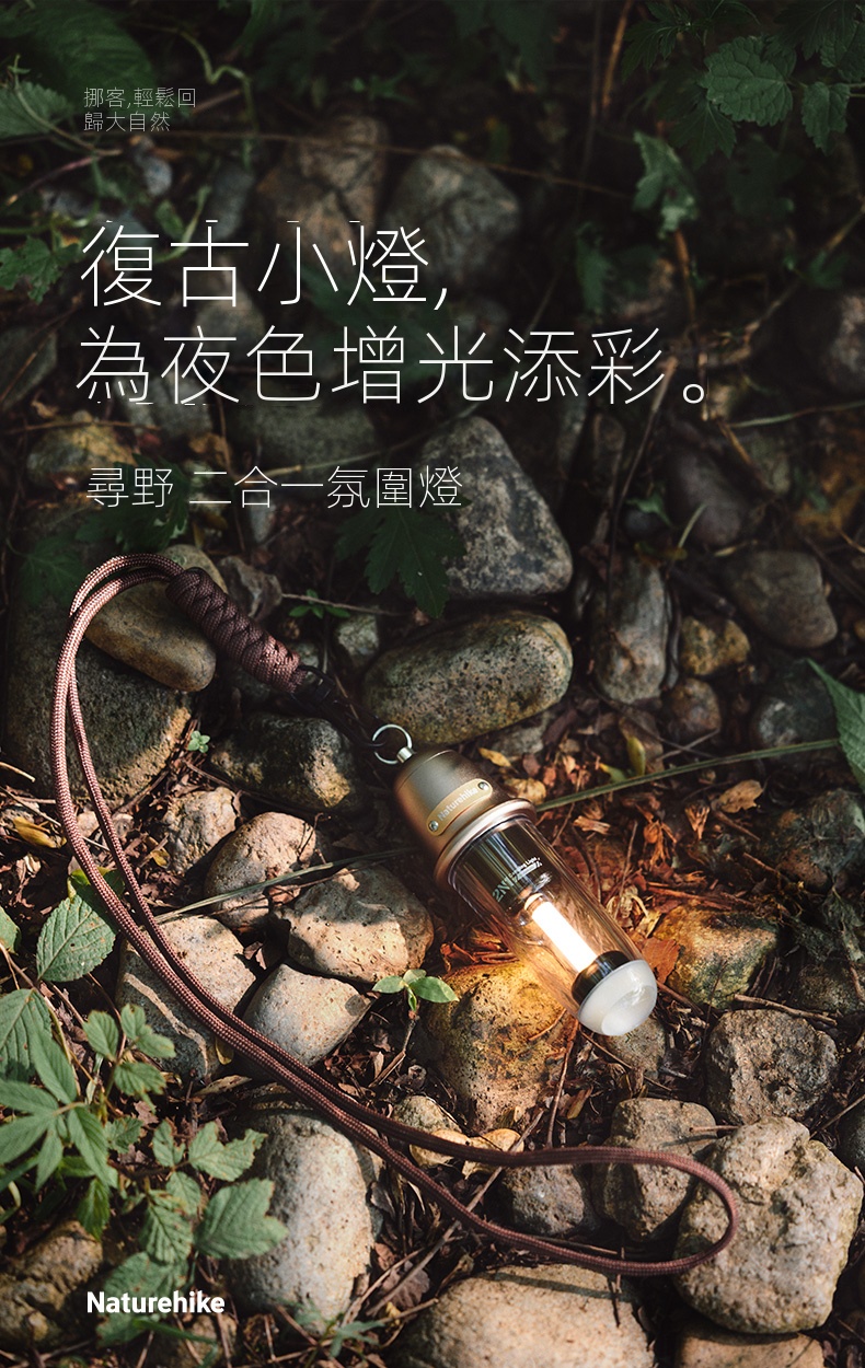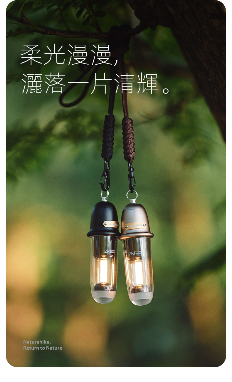 Naturehike尋野2合1露營氣氛燈,採用冷暖雙光源設計,提供二檔調節,輕鬆切換手電全亮、半亮及氛圍燈模式,滿足不同場景需求。配備便攜掛繩,且十分輕巧,方便攜帶。陽極氧化工藝打造高級金屬光澤,IPX4防水等級無懼雨天。Type-C開蓋充電,續航時間達3-8小時。無論是露營還是戶外活動,這盞燈都能為您增添溫馨氛圍,照亮每段旅程。
