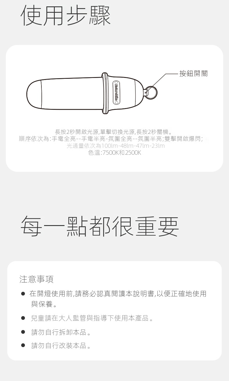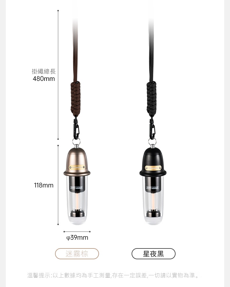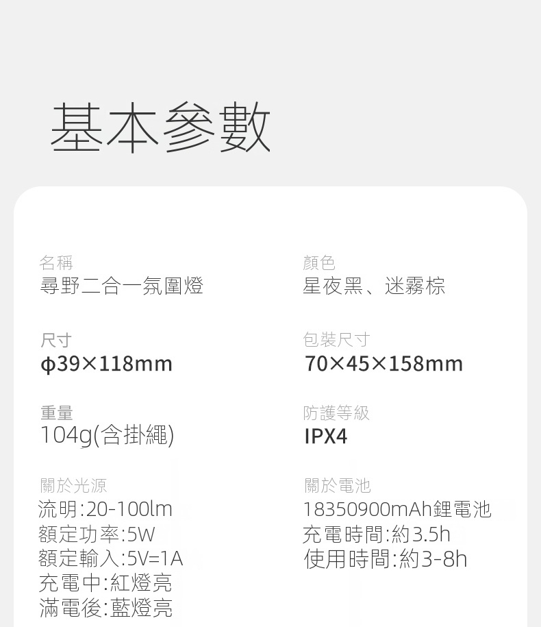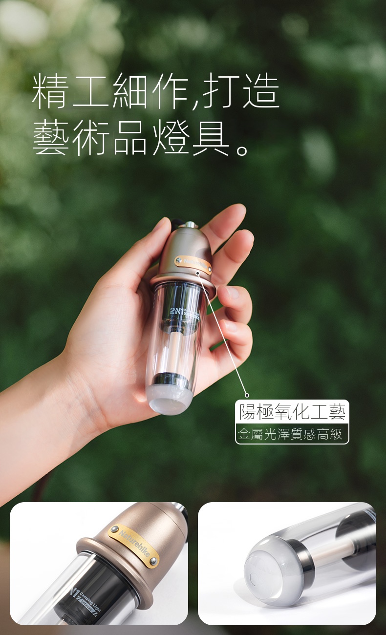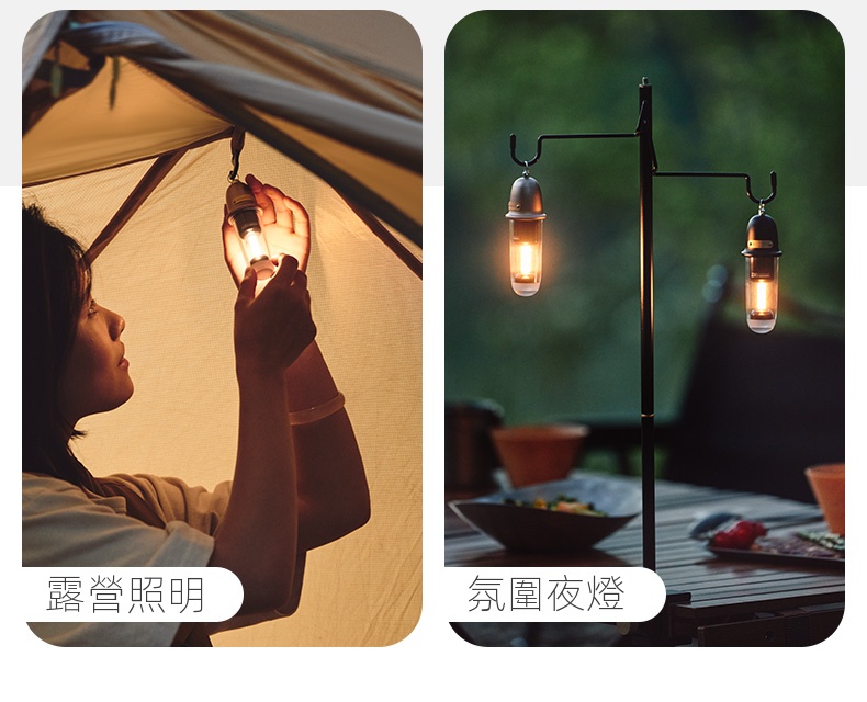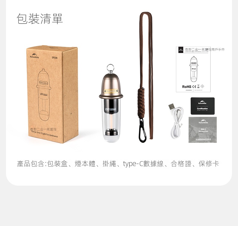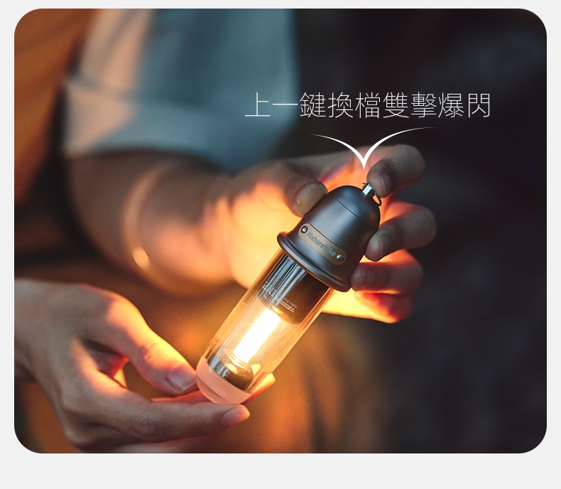 Naturehike尋野2合1露營氣氛燈,採用冷暖雙光源設計,提供二檔調節,輕鬆切換手電全亮、半亮及氛圍燈模式,滿足不同場景需求。配備便攜掛繩,且十分輕巧,方便攜帶。陽極氧化工藝打造高級金屬光澤,IPX4防水等級無懼雨天。Type-C開蓋充電,續航時間達3-8小時。無論是露營還是戶外活動,這盞燈都能為您增添溫馨氛圍,照亮每段旅程。