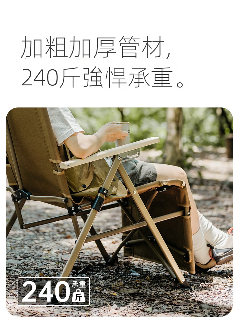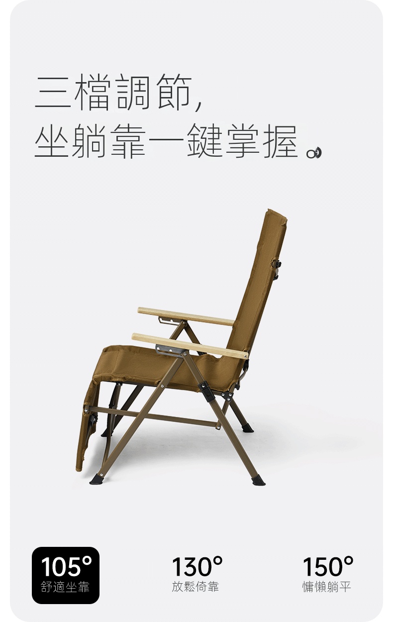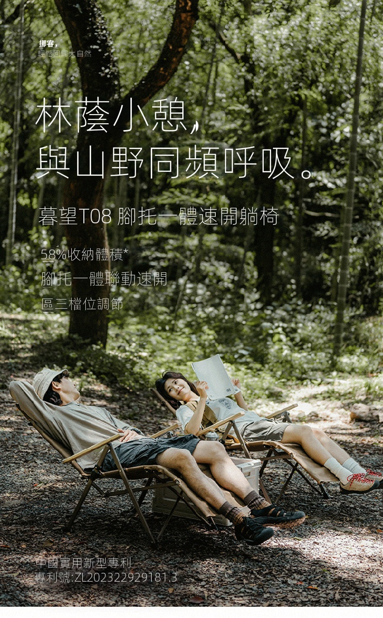 暮望T08速開折疊躺椅,採用腳托一體聯動設計與三檔位調節功能。其聚攏式收納設計使寬度減少58%,便於攜帶存放。起身時自動追背,一秒變座椅,免手動調整。600D加厚牛津布材質,透氣舒適且通過環保測試,無害健康。工形人體工學設計,貼合脊背並加高靠背,提供頭頸舒適承托,能承受達240斤的重量。無論是戶外休閒還是居家辦公午睡,都是您的最佳選擇。細節上配有防滑腳墊、舒適櫸木扶手等,展現對品質的追求。