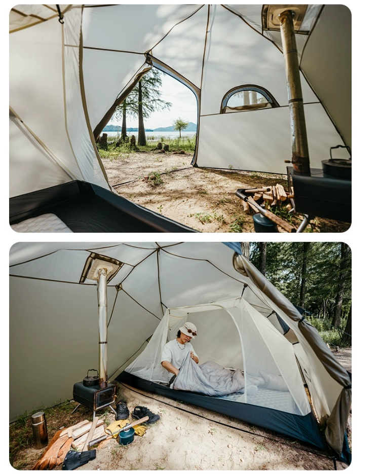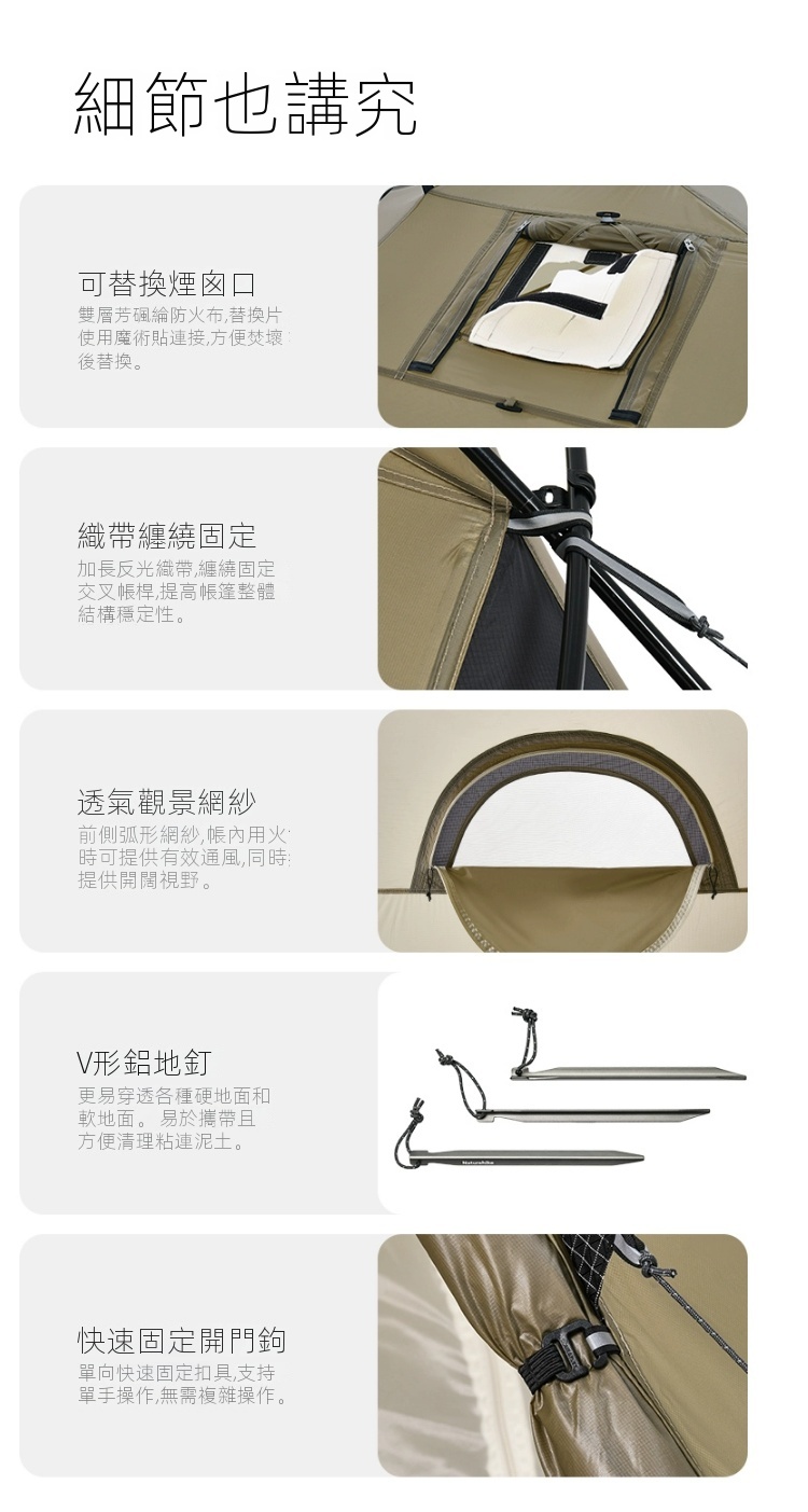 Naturehike 山坻 輕量化徒步帳篷是一款專為徒步旅行設計的高性能帳篷。其底部套管設計確保帳桿受力均衡,頂部挑桿提升內部空間,讓您享受更舒適的露營體驗。X型交叉結構增強抗風性能,並提供充足的自定義布局。獨立外帳搭建,通透設計使內部更加舒適。特設防火煙囪口,便於搭配柴火爐,並可替換防火布,保障安全。反光織帶和V形鋁地釘提高穩定性及便攜性,快速開門鉤設計支持單手操作,是露營的理想選擇。