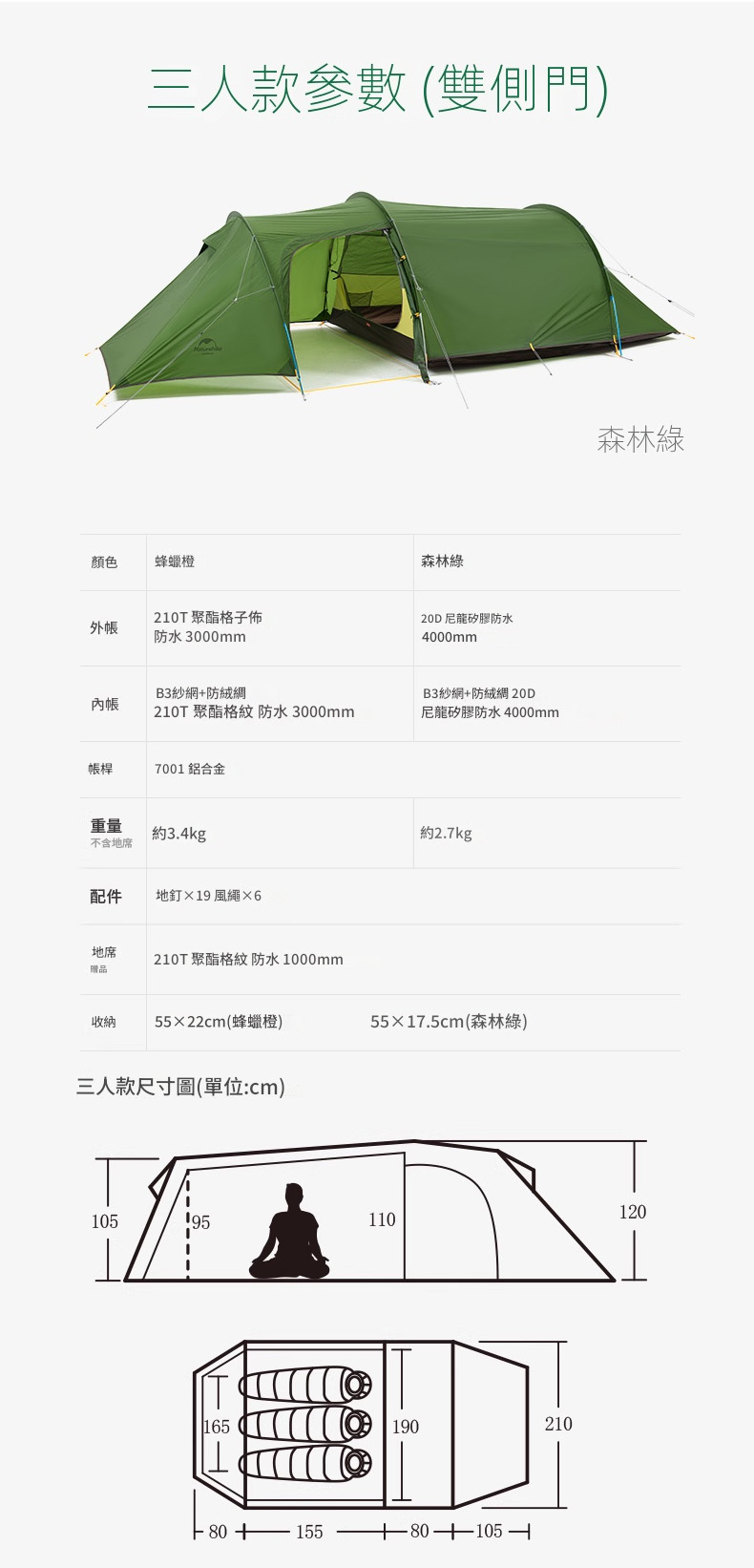 Naturehike Opalus 超輕隧道帳篷(NH17L001-L) - 森林綠(三人款) | 應對多變天氣 | 通風透氣