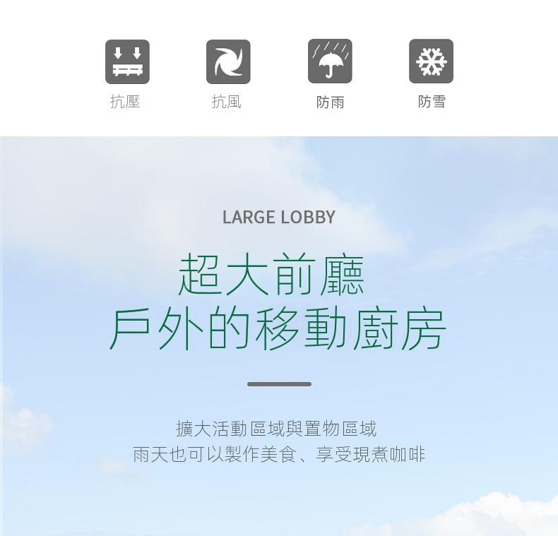 • 抗壓抗風,擁有超大前廳,擴大活動與置物區域,雨天也能製作美食和享受現煮咖啡