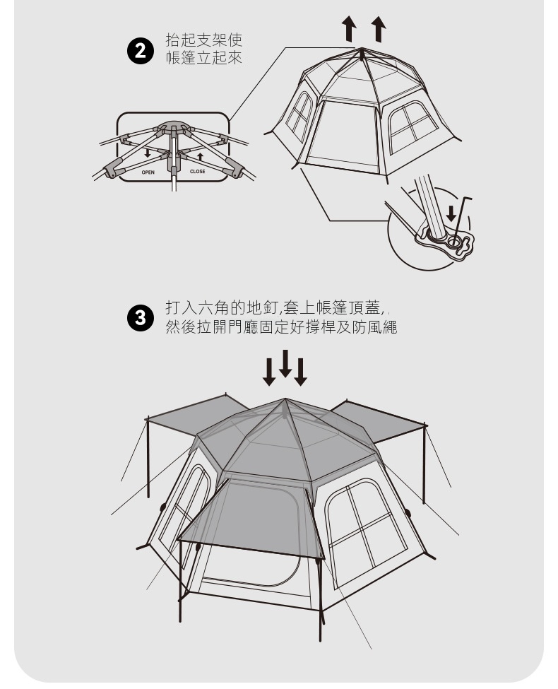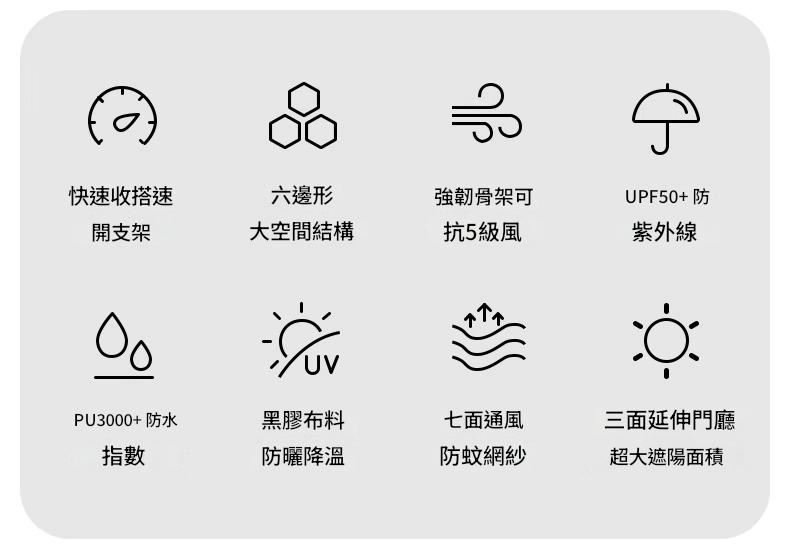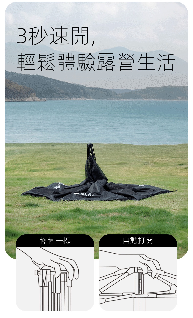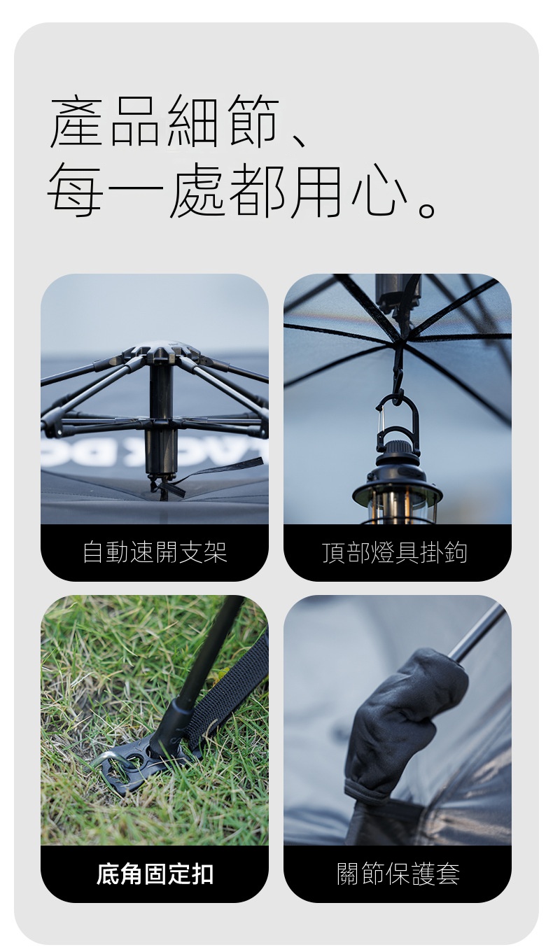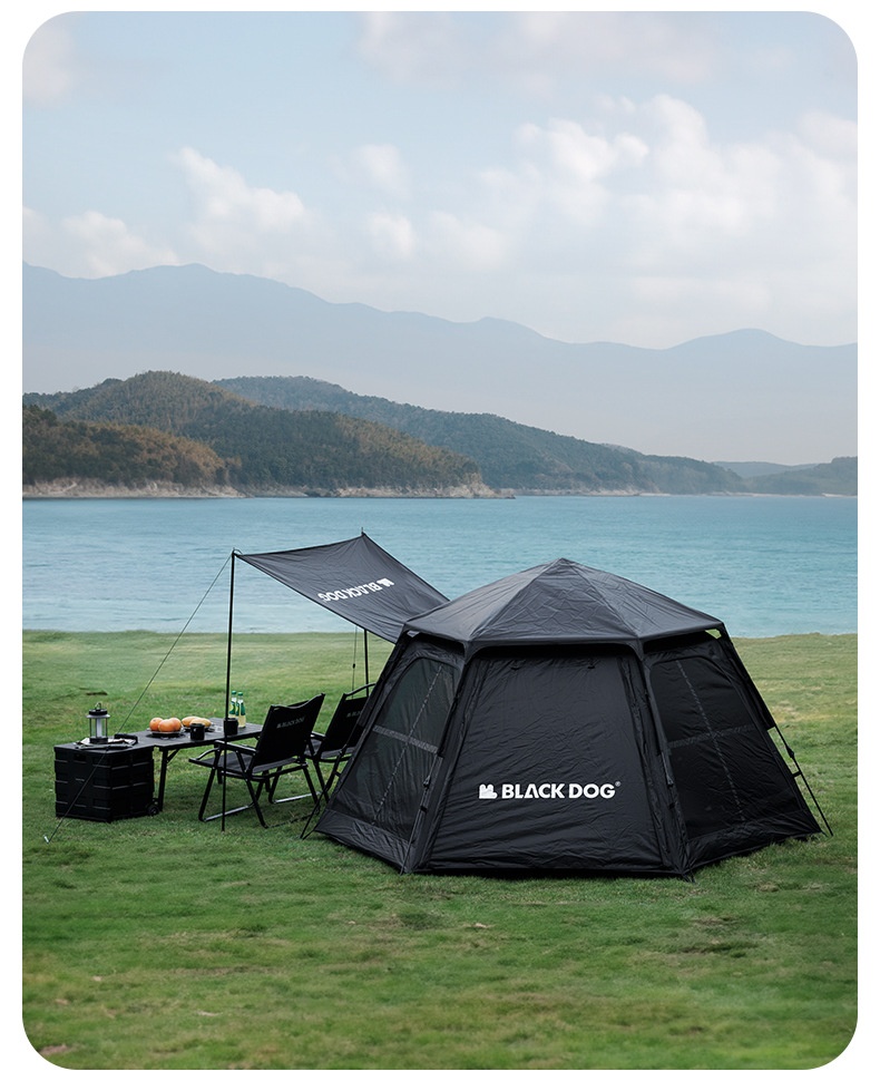 BLACKDOG六穹六角自動帳篷,採用速開設計,僅需3秒即可輕鬆展開。六邊形強韌骨架結構,抗5級風,配備七面透氣窗與防蚊網紗,提供360°循環通風,讓您享受清新空氣的同時有效防蚊。UPF50+黑膠防曬面料,阻隔紫外線,兼具防水、防曬、降溫功能,適合各種天氣條件。