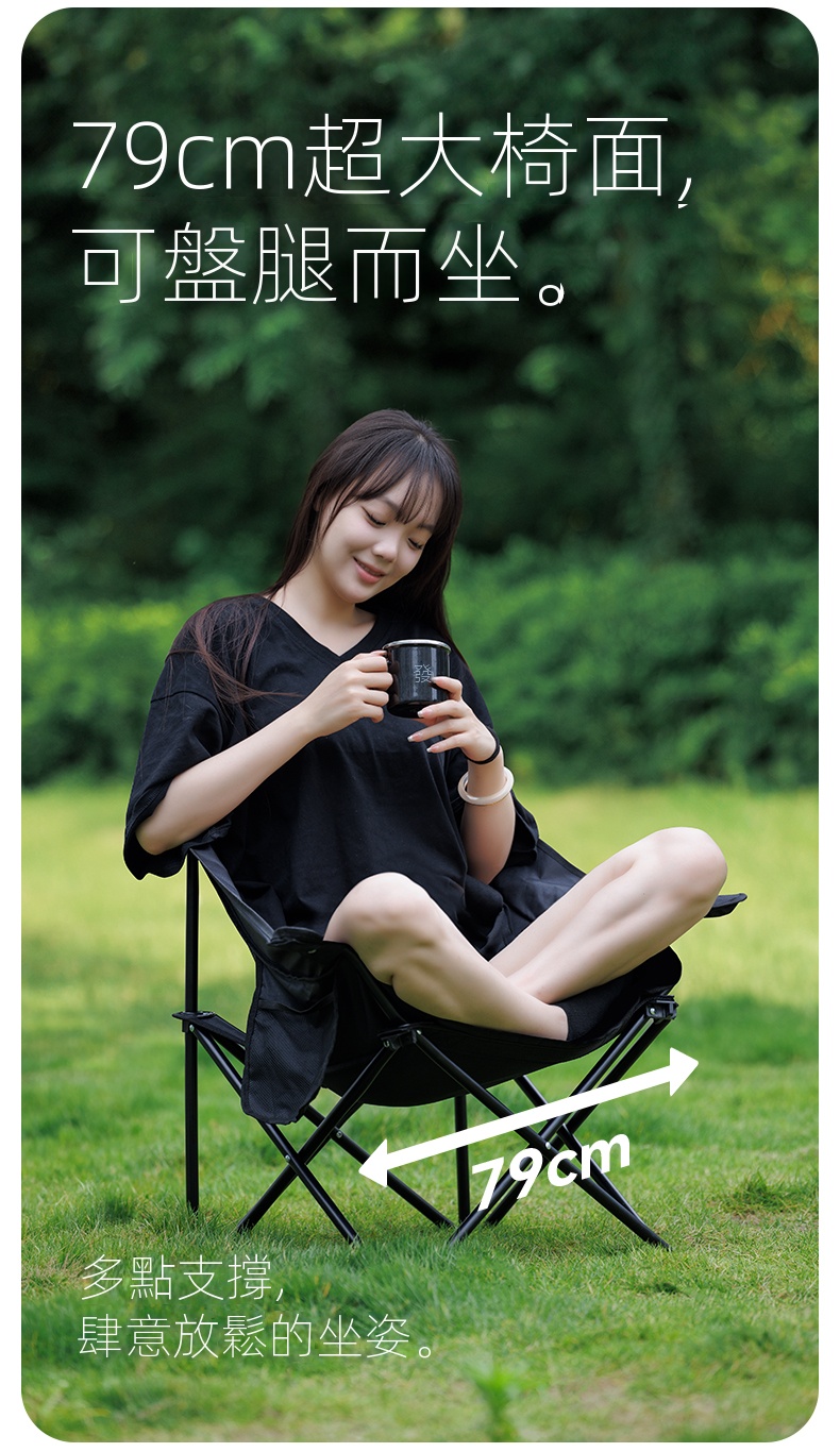 • 超強承重能力,椅面寬達79cm,可盤腿而坐