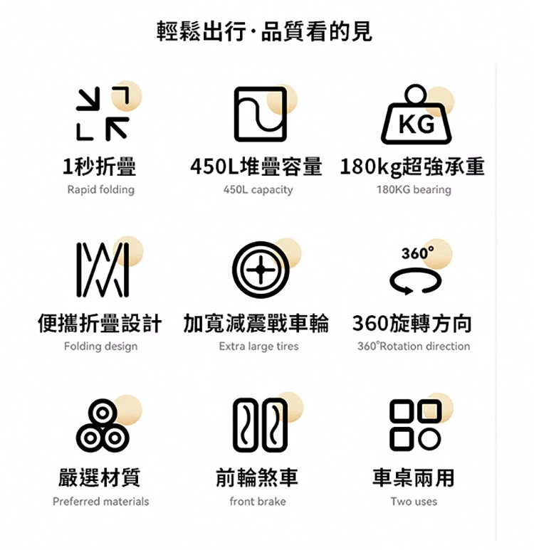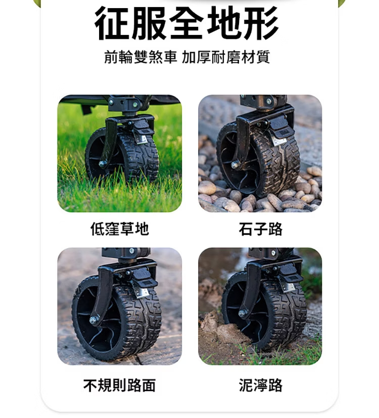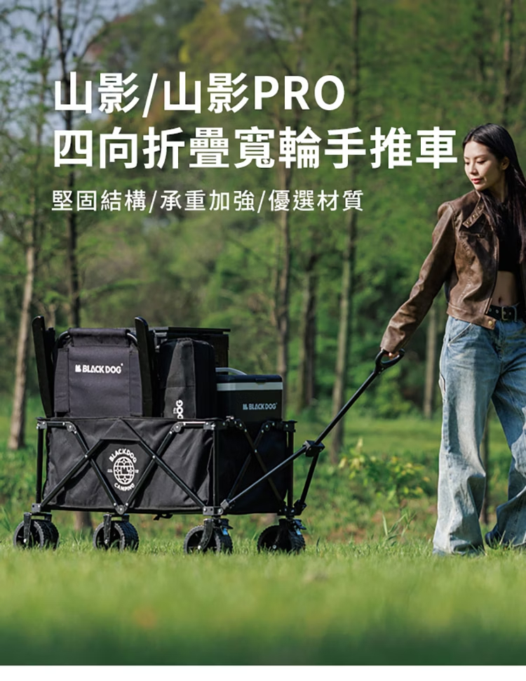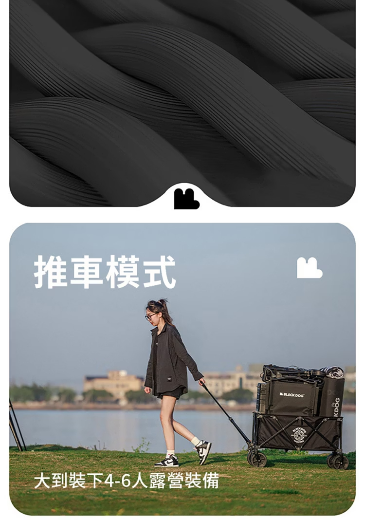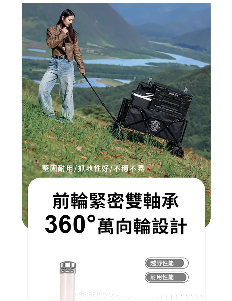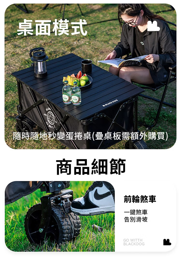 想要戶外露營輕鬆無憂?快來看看BLACKDOG山影露營車吧!這款露營車專為戶外愛好者設計,是你的露營好幫手。它採用10cm萬向坦克輪,搭配雙軸承,轉向順滑,無論是草地、沙地還是崎嶇小路,都能輕鬆應對。配備可煞車前輪,停靠更安全。車架選用優質金屬材質,堅固耐用,承載能力強,最大承重可達120kg,輕鬆裝下各類露營裝備。車籃經39.5CM加高處理,擁有超大容量。更貼心的是,它具備聚攏收納功能,折疊後體積小巧,方便攜帶與存放,為你的戶外出行減輕負擔。