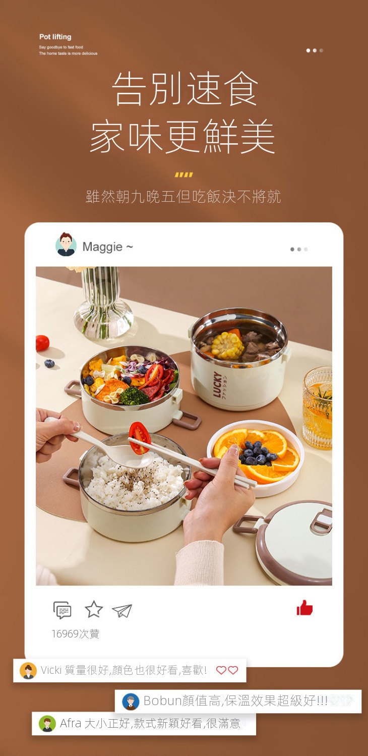 這款多層便攜式保溫便當盒,是忙碌生活中的貼心伴侶。它通常採用3 - 4層精巧設計,不同食物可分類存放,有效避免串味,滿足多樣飲食需求。主體選用食品級304甚至316不鏽鋼材質,耐腐蝕、耐高溫,安全可靠。內部運用雙層真空保溫技術,從傳導、輻射、對流三方面減少熱量損失,保溫效果出色,冬日清晨裝入的飯菜,到中午依然溫熱可口。每層配備獨立密封蓋與防漏矽膠圈,密封性強,通勤途中湯汁也不易外溢。其手提設計便捷,無論是日常上班、學生上學,或是外出旅行,都能輕鬆攜帶,隨時享受溫暖美食 。