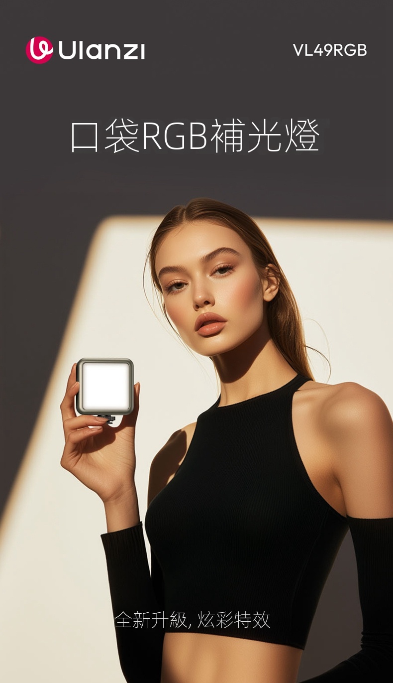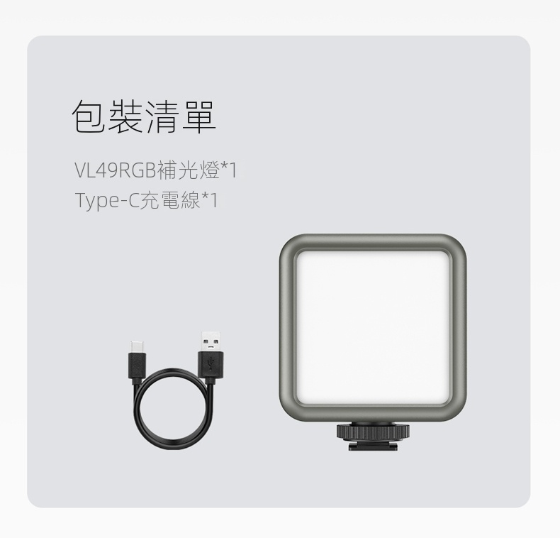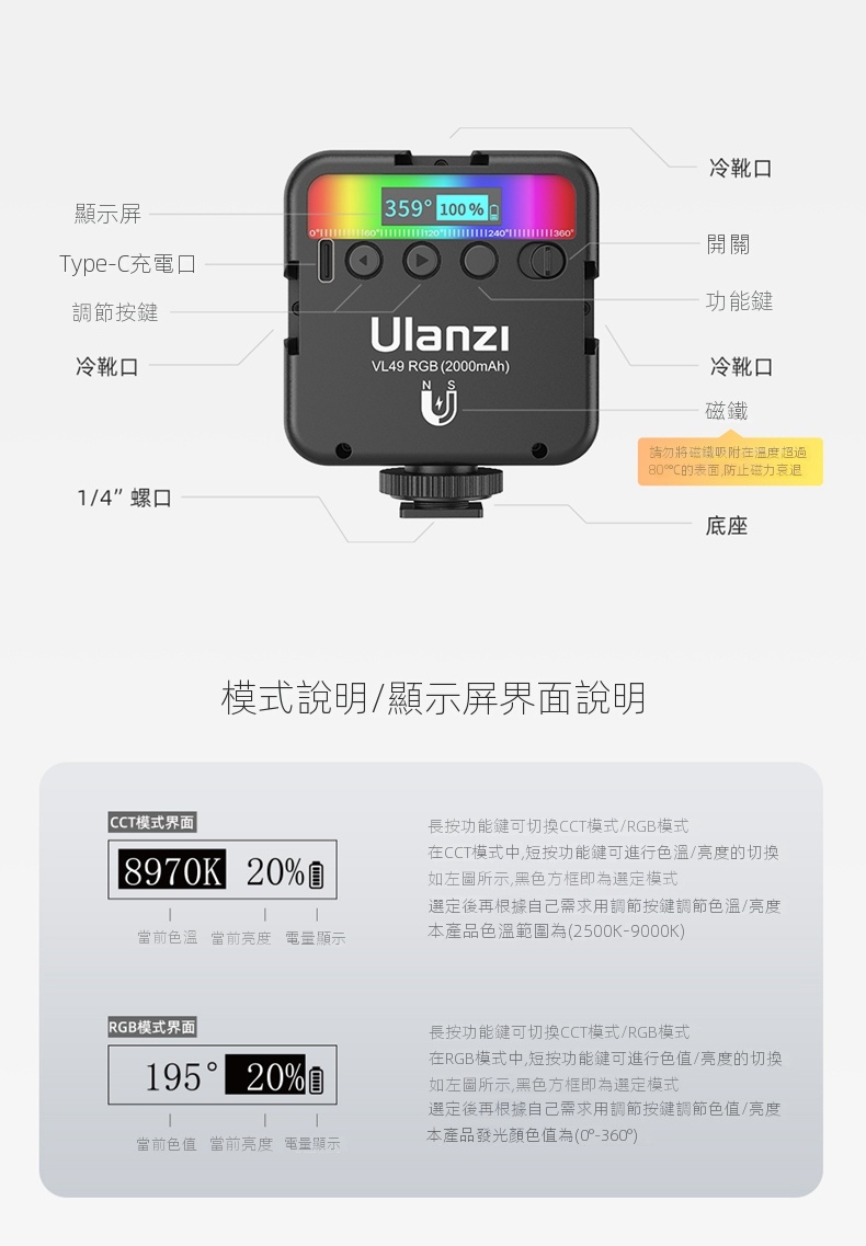 Ulanzi VL49RGB迷你便攜式LED補光燈,全新升級的白色口袋RGB補光燈,具備炫彩特效和創意影像功能。支援2500-9000K色溫範圍及13種情景特效模式,輕鬆模擬真實場景,為攝影、直播和VLOG提供多樣化選擇。採用60顆高顯色燈珠,光照角度達120°,亮度可達800LUX@0.5m,CRI95+確保色彩真實還原。內建LCD顯示屏,實現色彩與亮度的精確控制,並配有磁吸設計,方便吸附於金屬表面,支持三腳架、手機夾等設備連接。搭載大容量鋰電池,Type-C盲插充電,讓靈感不斷電。重量約100g,輕巧便攜,是您創作的最佳夥伴。