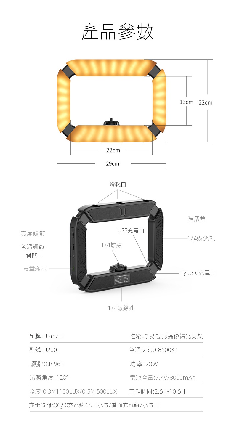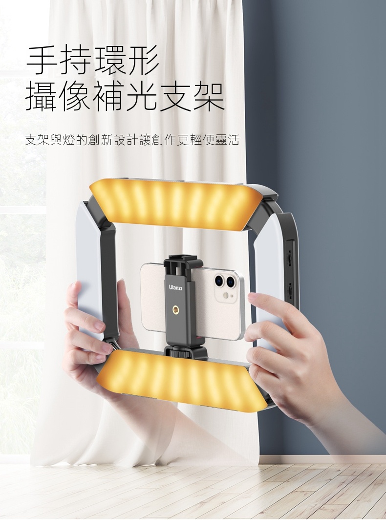 手持環形補光攝影支架Ulanzi U200,創新設計讓創作更靈活。具備可調控的環形發光面,長按開關、短按切換發光模式,適用於直播、美妝拍攝等多場景。無級調節亮度20%-100%,色溫範圍2500K-8500K,顯色指數高達96+,還原真實色彩。內建8000mAh大容量電池,續航時間長達2.5小時,支援反向充電,延時拍攝不愁手機電量。配備三冷靴口,可外接麥克風或擴展燈光設備。底部及側面設有1/4螺絲孔,兼容相機、手機等設備,支持橫豎拍。隱藏式支撐腿和防滑膠墊設計,提供穩固支撐。附贈手機夾、充電線及說明書,滿足多樣化需求。