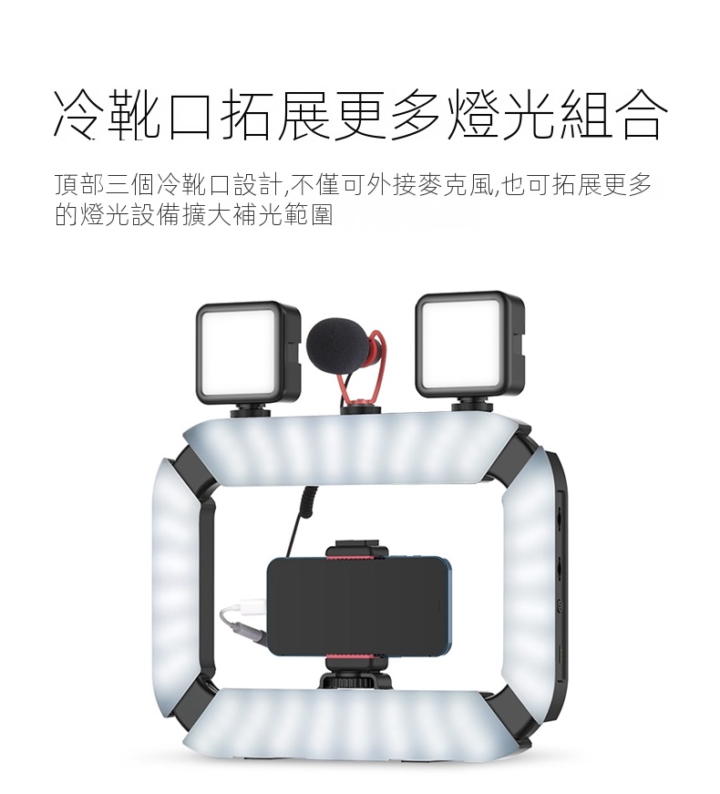 • 頂部三個冷靴口設計,可外接麥克風或拓展更多燈光設備