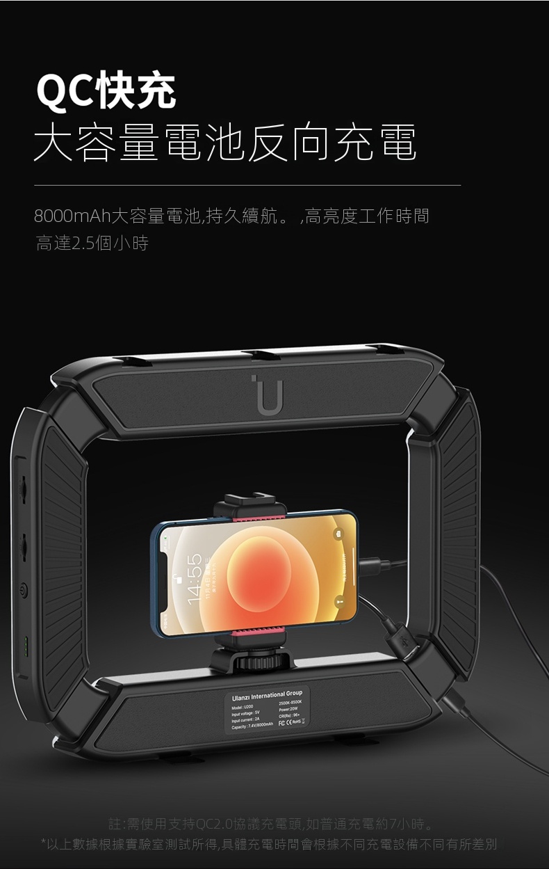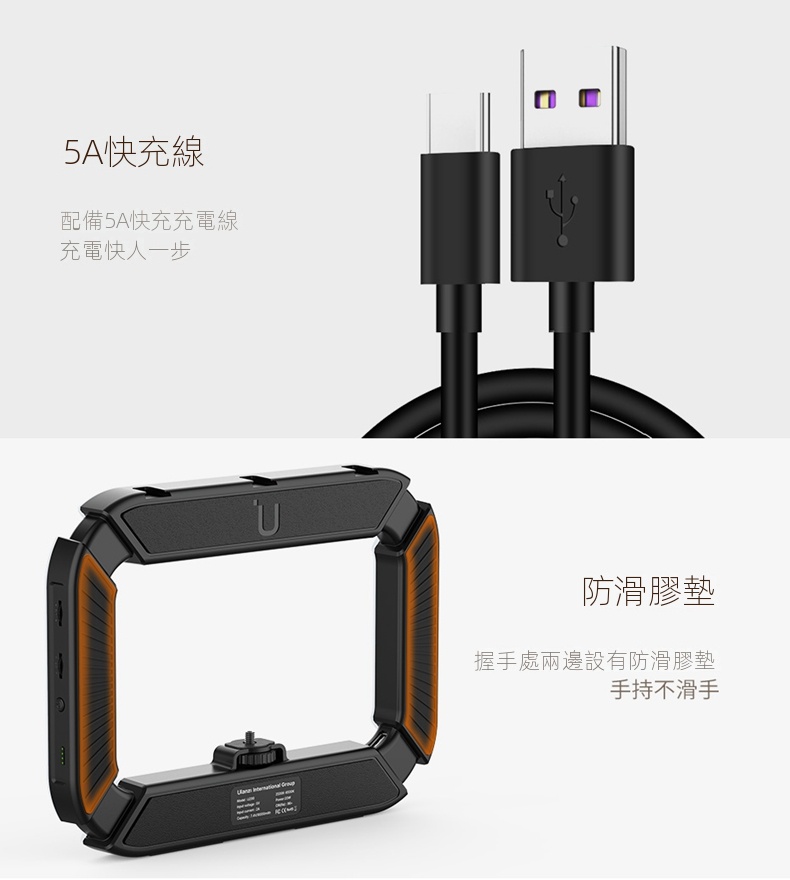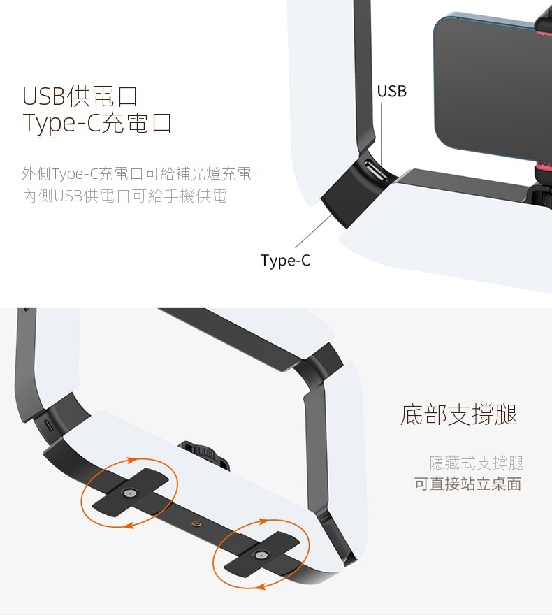 • 內建充電寶功能,Type-C充電口可給補光燈充電,USB供電口可給手機充電