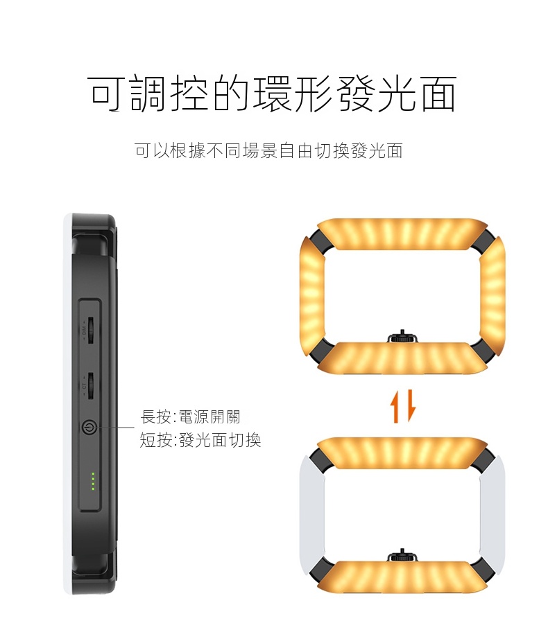 • 可調控的環形發光面,根據不同場景自由切換發光面(長按:電源開關;短按:發光面切換)