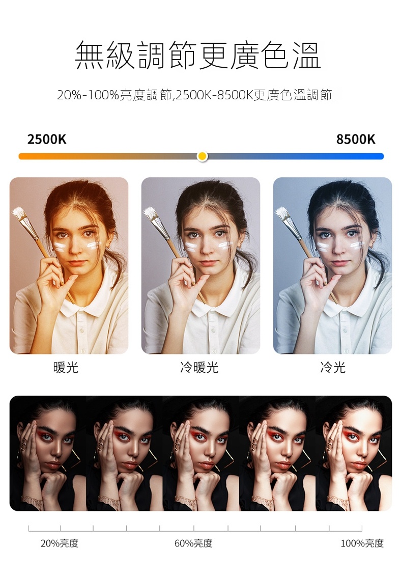 • 無級調節亮度20%-100%,色溫範圍2500K-8500K