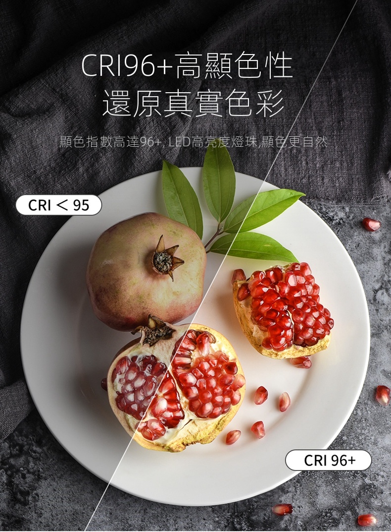 • CRI96+高顯色性,還原真實色彩,LED高亮度燈珠,顯色更自然