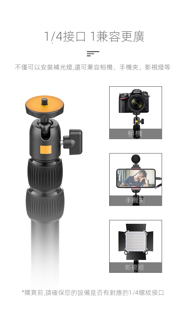 • 黑色1/4接口,兼容更廣泛的設備,如補光燈、相機、手機夾、影視燈等