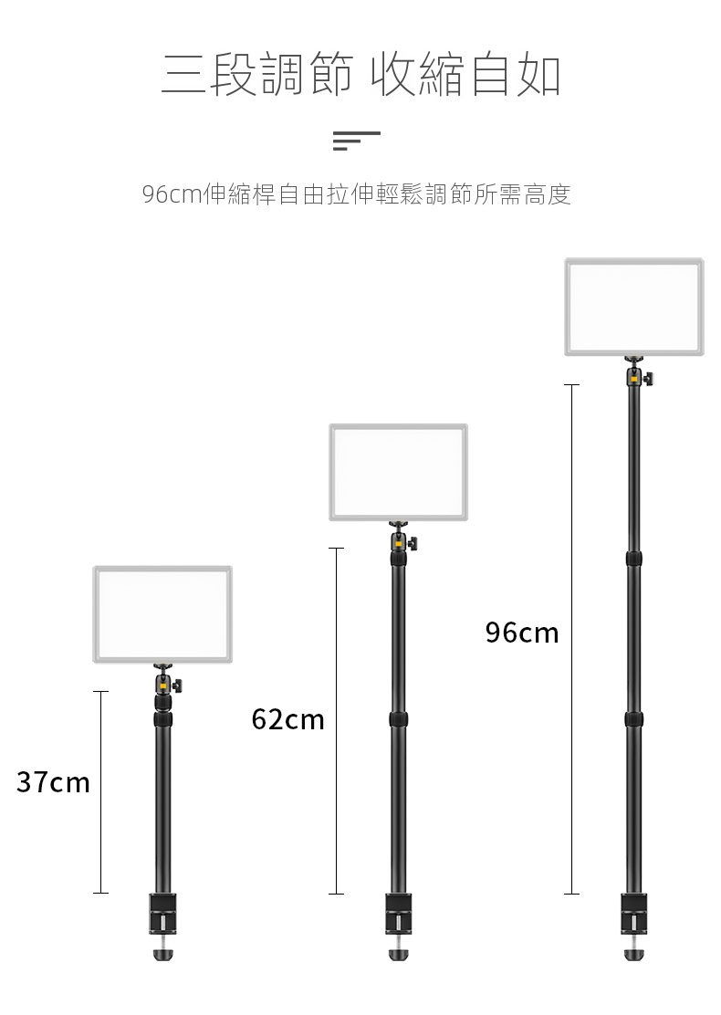 • 三段調節設計,96cm伸縮桿可自由拉伸,輕鬆調節所需高度
