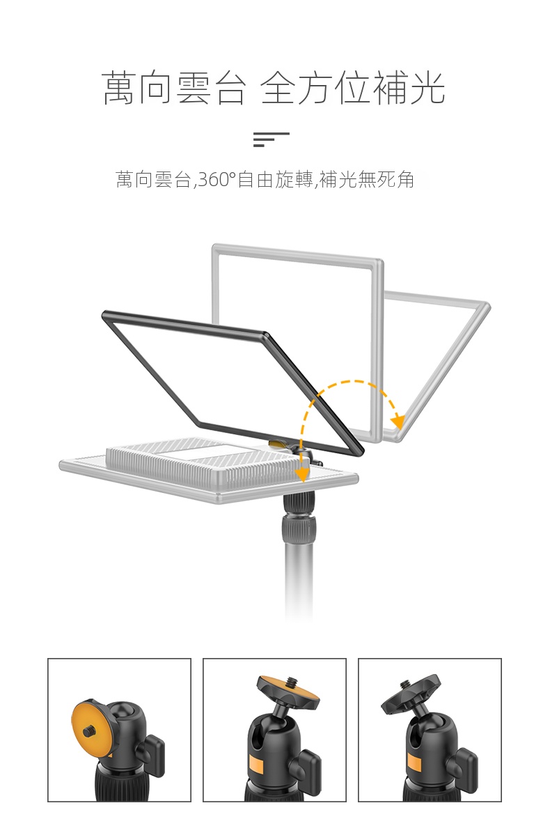 • 萬向雲台設計,360°自由旋轉,實現全方位補光,無死角