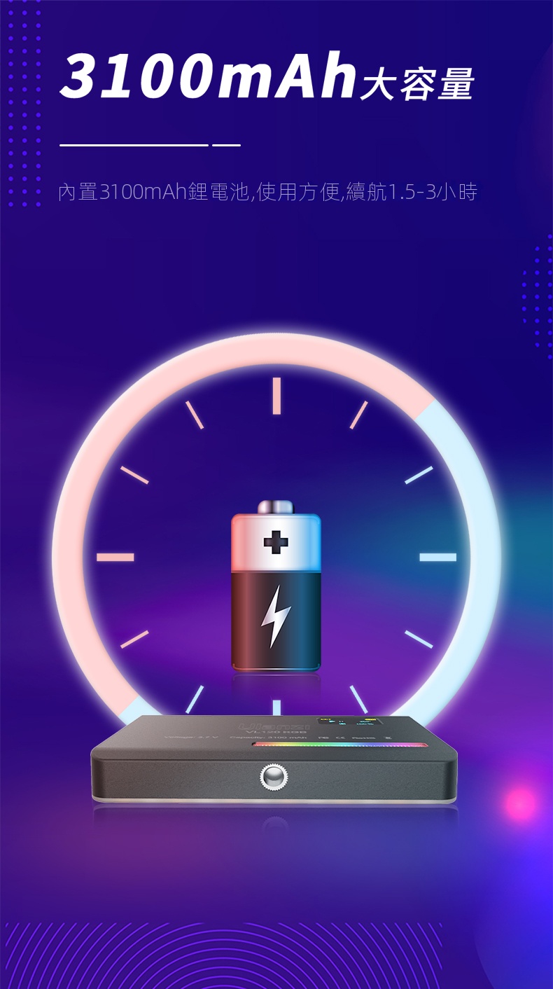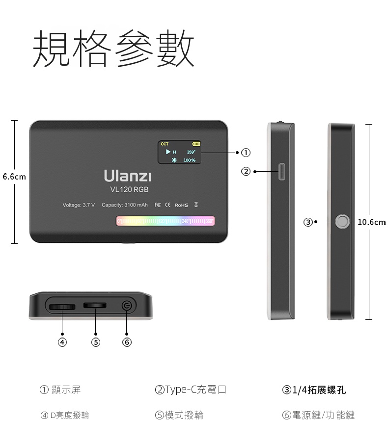 Ulanzi VL120RGB卡式補光燈,小巧便攜,巴掌大小可輕鬆放進口袋或攝影包。它擁有120顆高顯燈珠,白色、黃色各42顆,RGB燈珠36顆 。色溫範圍2500-9000K,顯色指數>95,能精準還原色彩。具備色溫、RGB、特效三種模式,20種光效,可模擬多種真實場景。亮度最高1250LUX(0.3m)。內建3100mAh鋰電池,續航1.5-3小時。底部1/4螺孔和冷靴口,方便外接設備。還有OLED液晶屏顯,參數調控一目了然,無論是人像、靜物拍攝,或是影片創作都適用。