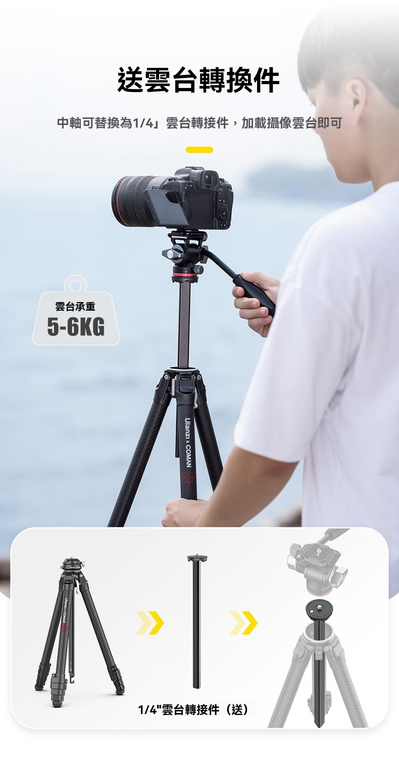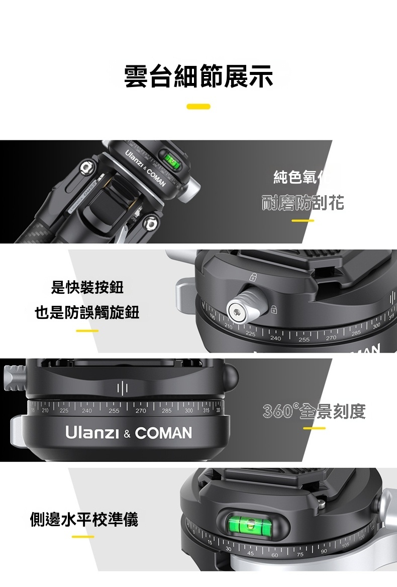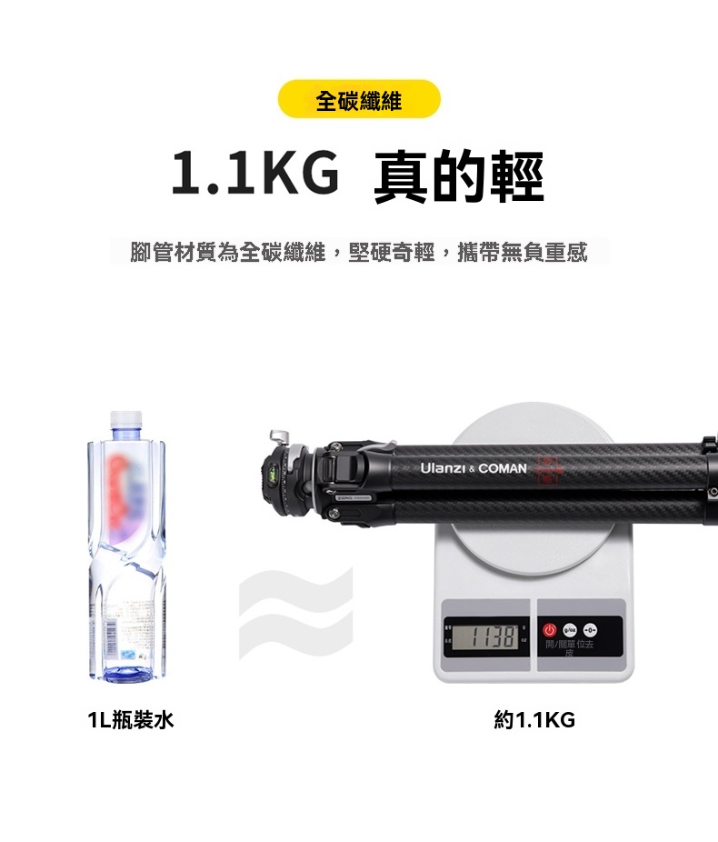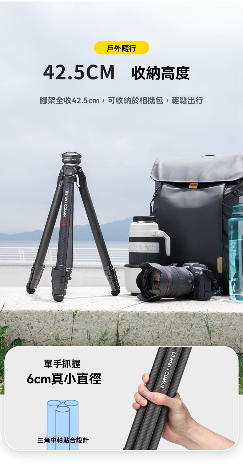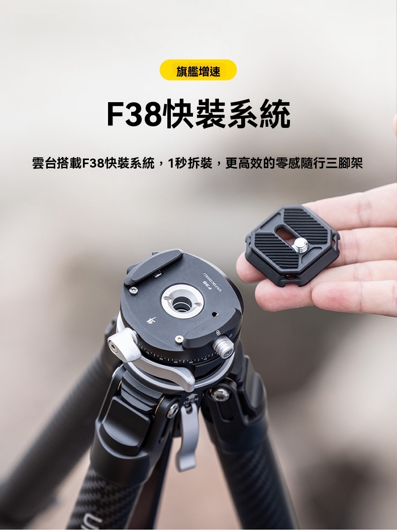 Ulanzi與Coman聯名推出的ZERO F38快裝三腳架,採用全碳纖維腳管,重量僅約1.1KG,輕巧便攜,適合戶外拍攝。雲台與腳架鏈接處為墨綠色設計,突顯時尚感。此款三腳架具備F38快拆系統及穩固扳扣式雲台,支持阿卡快裝,方便快速安裝拆卸。中軸可拆卸設計,讓您輕鬆實現低角度拍攝,並提供20°/55°/75°三檔腳管角度調節。承重達3KG,兼具輕盈與穩定性,適合旅行者隨行使用,收納長度僅42.3cm,可輕鬆放入相機包中。每支ZERO三腳架皆配有獨特編號,確保品質與專屬性。