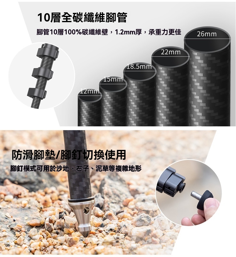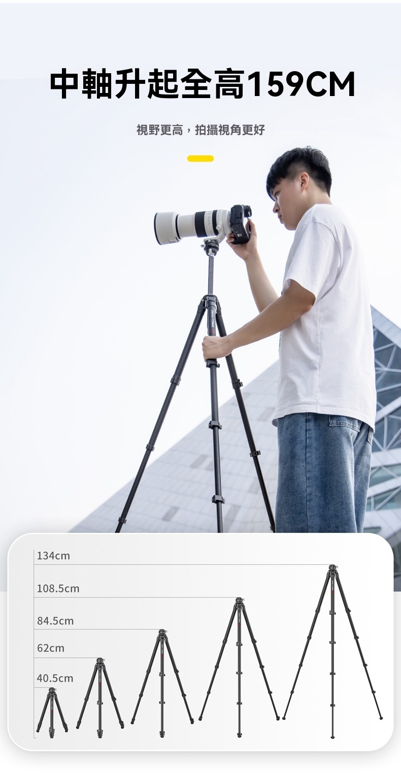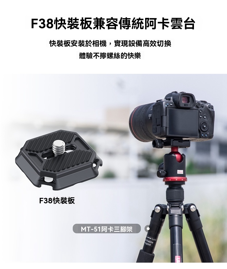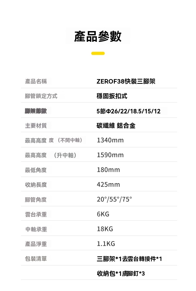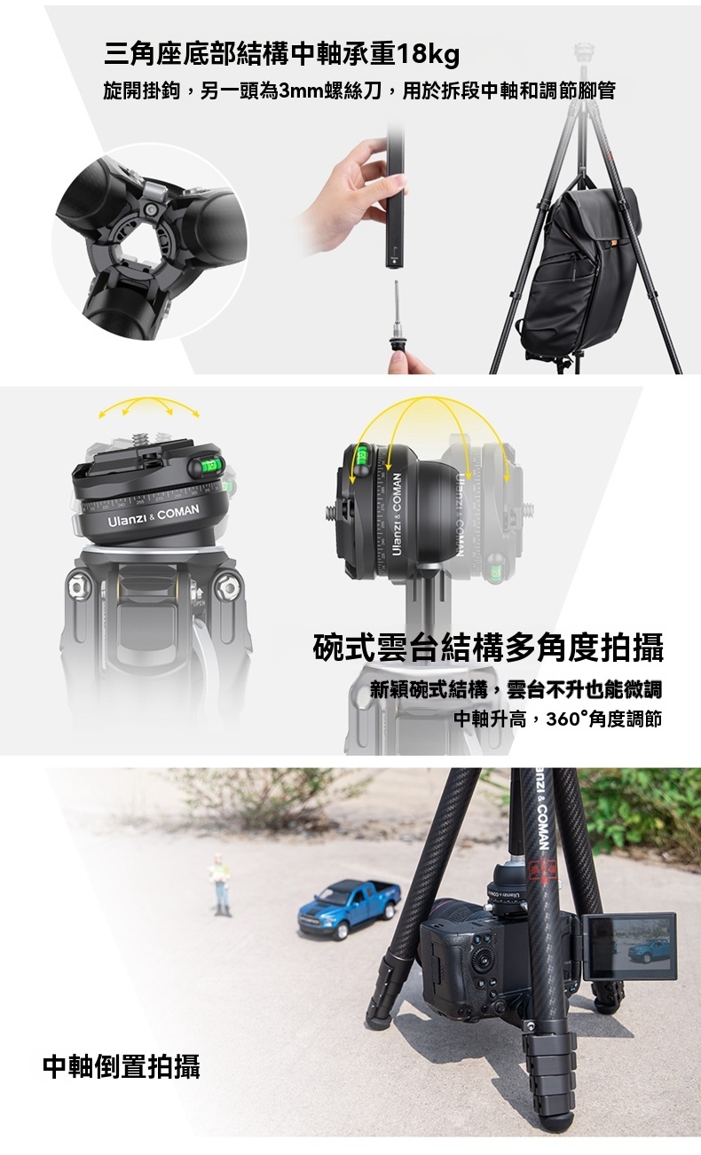 Ulanzi與Coman聯名推出的ZERO F38快裝三腳架,採用全碳纖維腳管,重量僅約1.1KG,輕巧便攜,適合戶外拍攝。雲台與腳架鏈接處為墨綠色設計,突顯時尚感。此款三腳架具備F38快拆系統及穩固扳扣式雲台,支持阿卡快裝,方便快速安裝拆卸。中軸可拆卸設計,讓您輕鬆實現低角度拍攝,並提供20°/55°/75°三檔腳管角度調節。承重達3KG,兼具輕盈與穩定性,適合旅行者隨行使用,收納長度僅42.3cm,可輕鬆放入相機包中。每支ZERO三腳架皆配有獨特編號,確保品質與專屬性。