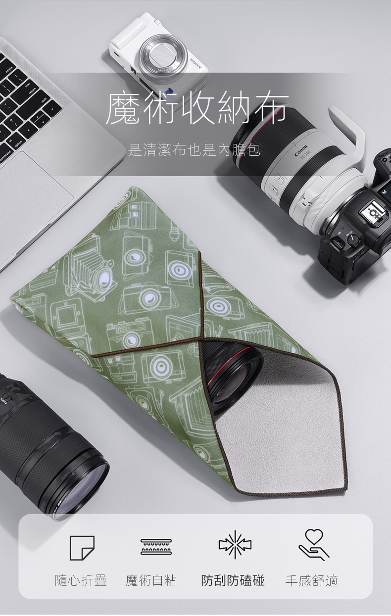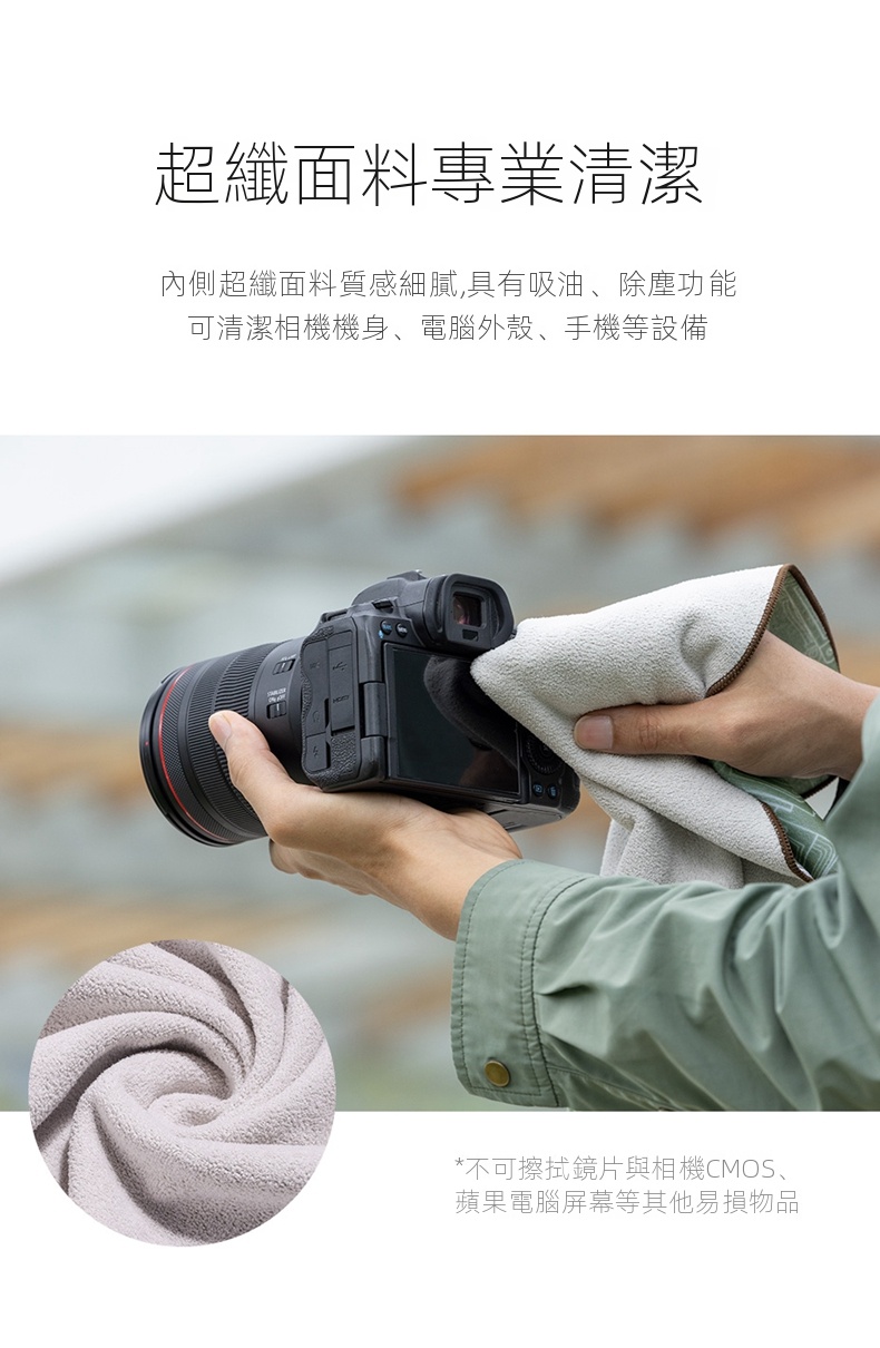 • 內側採用專業超纖面料,質感細膩,具有吸油、除塵功能,適合清潔相機機身、電腦外殼和手機等設備(不適用於擦拭鏡片、相機CMOS或蘋果電腦屏幕等易損物品)。