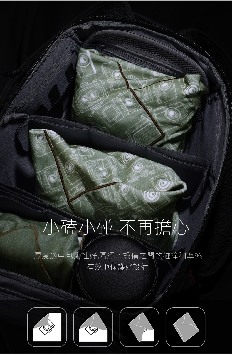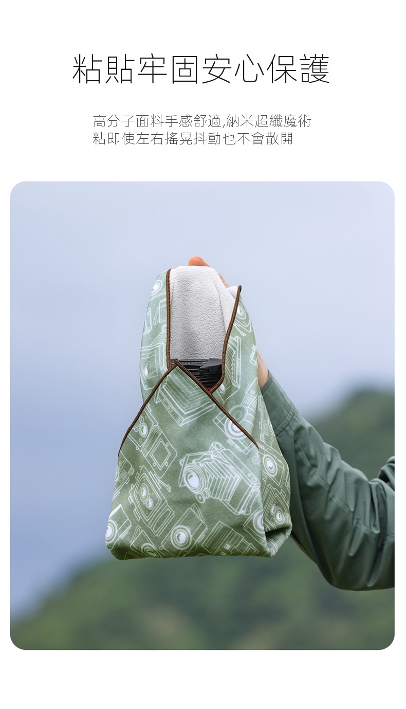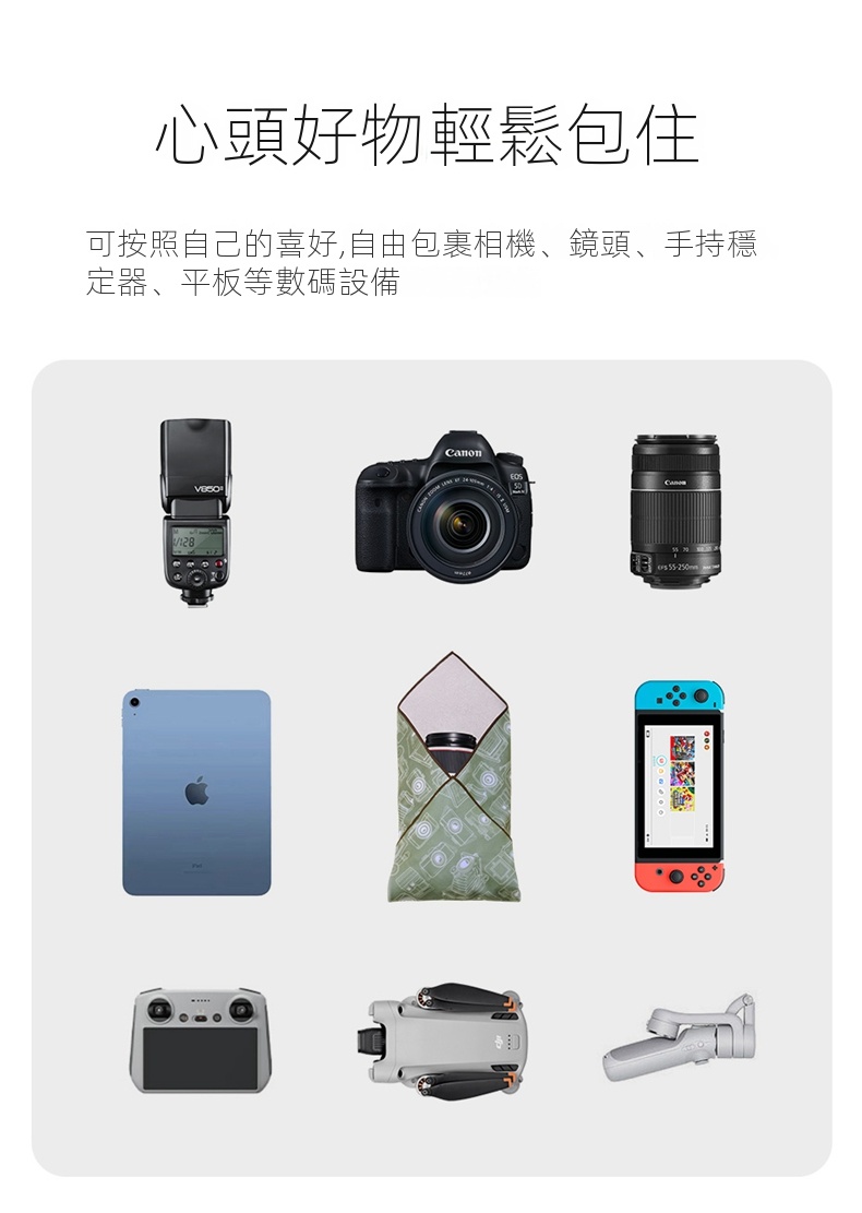 • 輕鬆包住各類數碼設備,如相機、鏡頭、手持穩定器和平板等,根據個人喜好自由包裹。