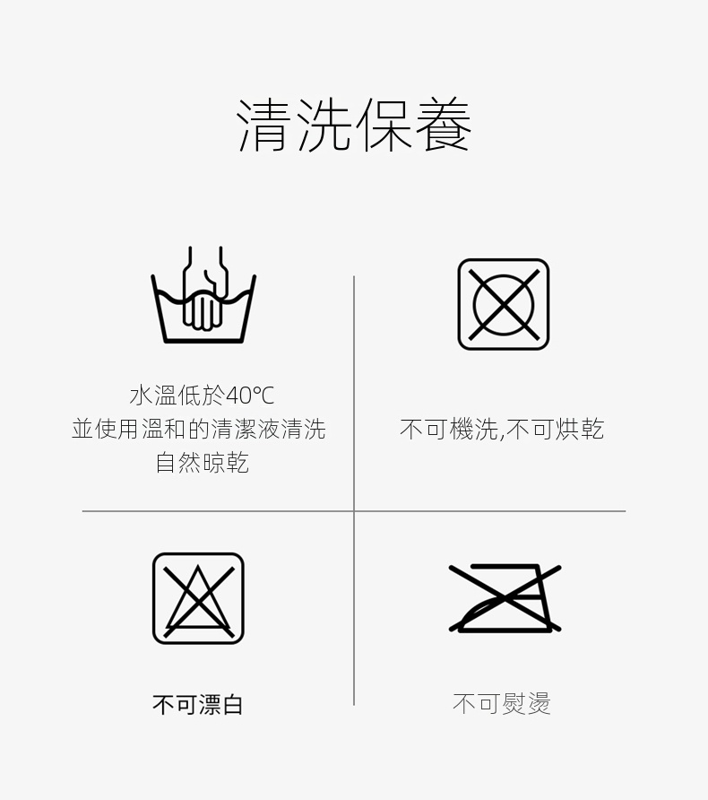 • 清洗保養:水溫低於40℃並使用溫和的清潔液清洗,不可機洗,不可烘乾,自然晾乾,不可熨燙