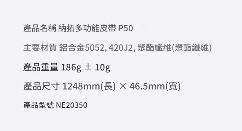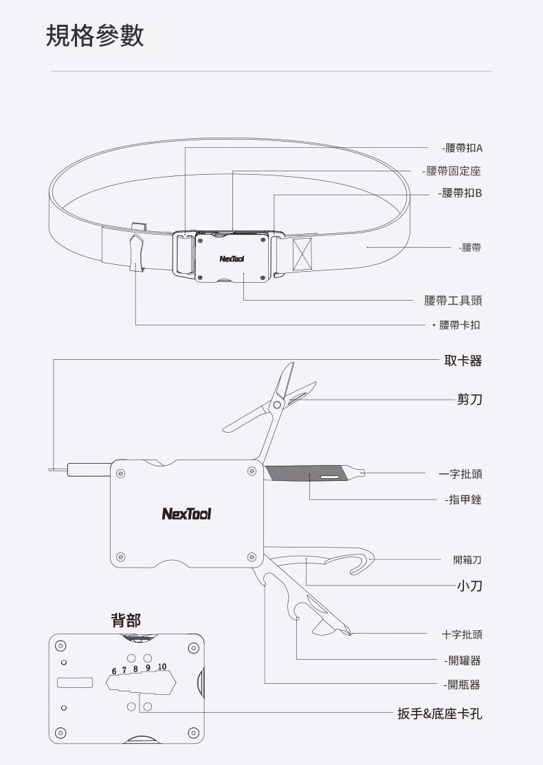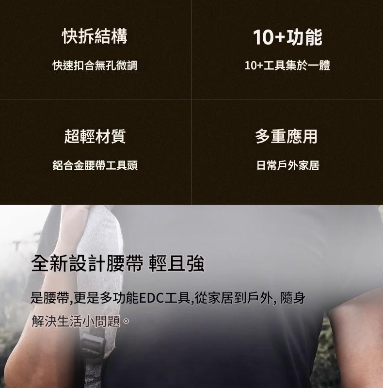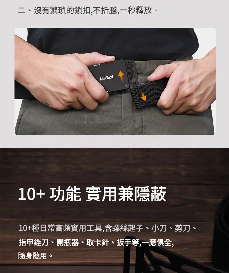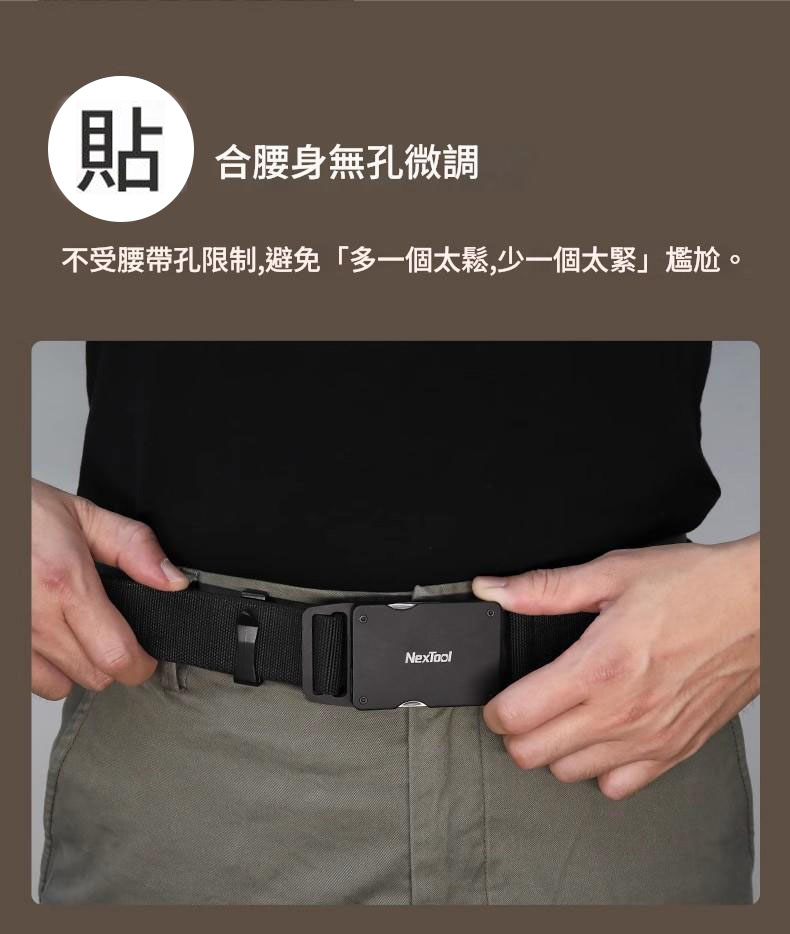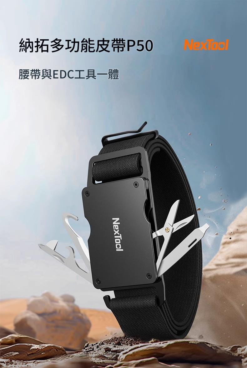 Nextool納拓P50多功能皮帶,將皮帶與edc工具創新融合,居家戶外皆適用。它採用快拆結構,分離式工具頭能輕鬆取下獨立使用,無繁瑣鎖扣,一秒即可釋放 。腰帶配備10+種日常高頻實用工具,像螺絲起子、小刀、剪刀、指甲銼刀、開瓶器、取卡針、扳手等,滿足多樣化需求。高級聚酯外層搭配彈性夾層編織,耐磨厚實,還不勒腰。貼合腰身無孔微調,避免了孔位不合適的尷尬。工具頭僅重52g,腰間無明顯負重感,戶外風格夠硬朗,掛載裝備無負擔,且簡約百搭,適配各種場合。