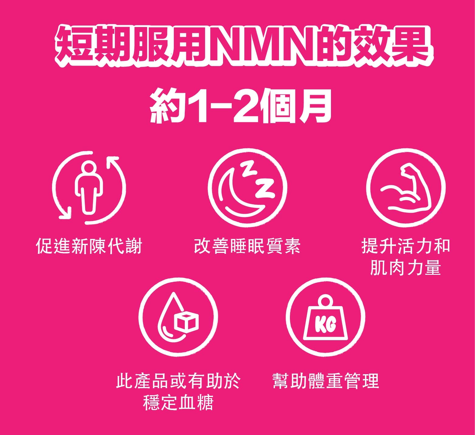 注意:停用產品不會倒退已逆轉的健康效果。NMN現只在臨床階段,剛已完成100人的1期臨床測試,正展開2期中。