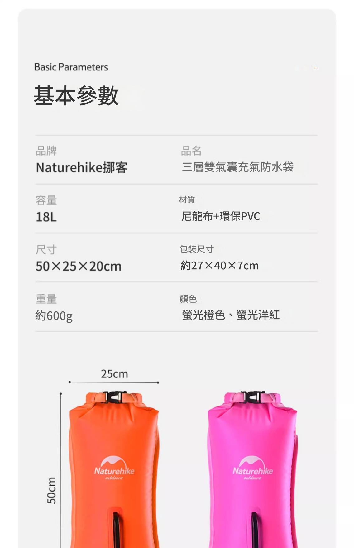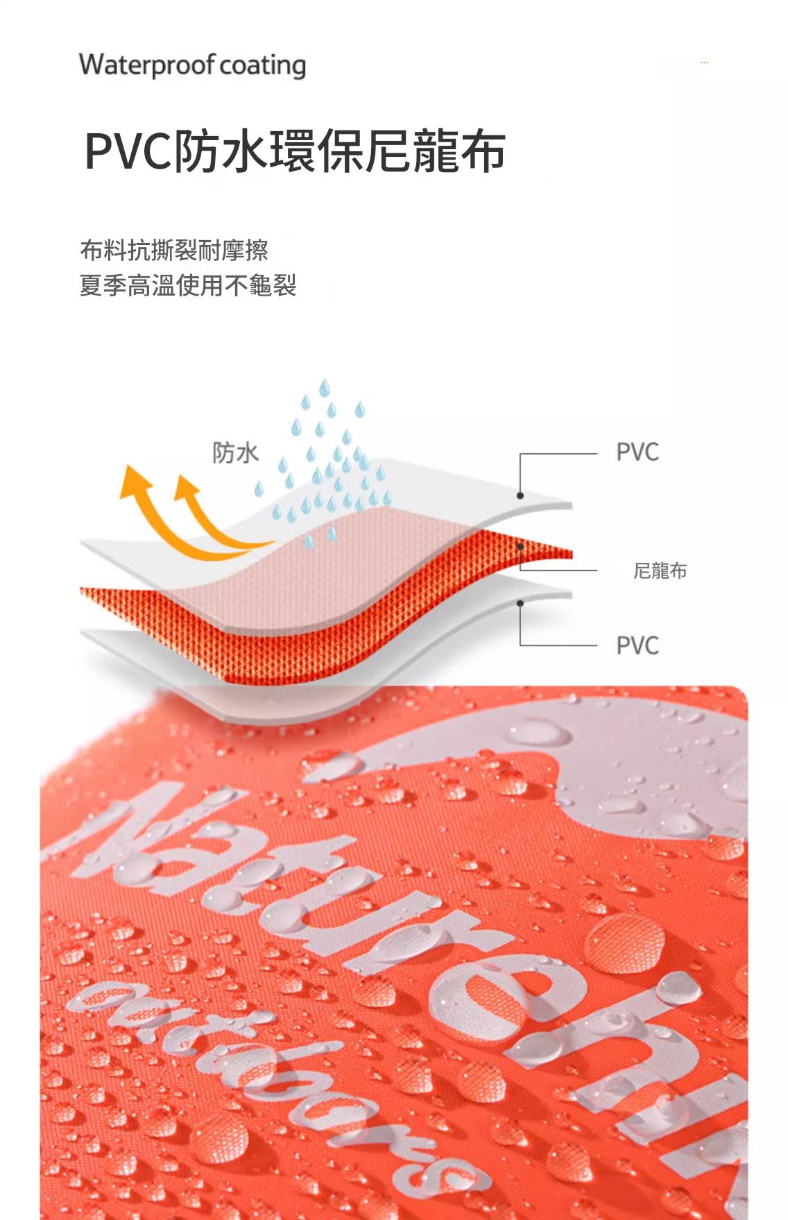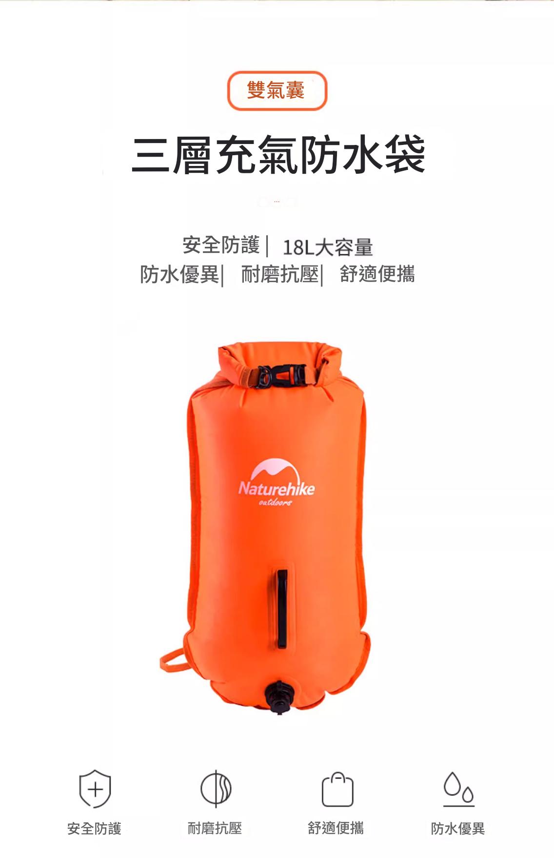 Naturehike 18L三層充氣防水袋是戶外愛好者的必備好物。它尺寸為50*25*20cm,容量18L,空間規劃合理,可輕鬆收納出行必備物品。採用約65紗加厚防水耐寒尼龍,質地堅韌,耐磨抗撕裂,無論是戶外剮蹭或低溫環境都能應付自如。獨立雙氣囊設計,不僅提供更大浮力,即使一個氣囊出現問題,另一個也能保障安全。雙層氣嘴設計,充氣放氣快速方便。防水性能卓越,達到IPX8級深度防水,ABS封口夾搭配鎖扣旋鈕,多重密封確保滴水不漏。無論是水上運動還是潮濕環境下的探險,它都能全方位保護你的物品,讓你安心享受戶外時光。