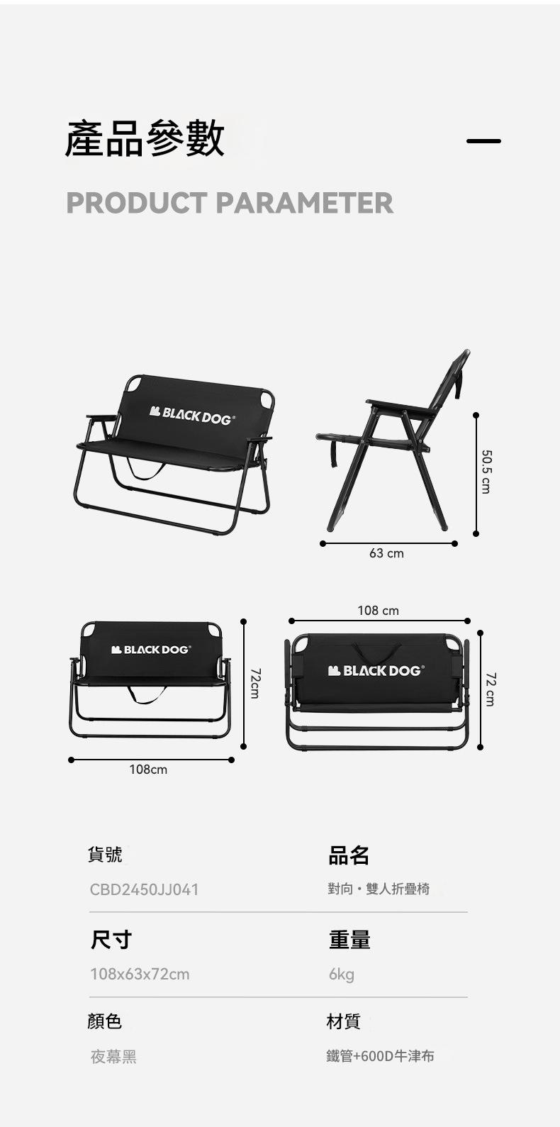BLACKDOG對向雙人戶外折疊椅,戶外休閒新寵來襲!雙人寬座設計,為你和同伴提供寬敞舒適空間,一同舒適享受戶外時光。椅子採用堅固鐵管支架,搭配600D牛津布,結實耐用,承重高達200KG,無懼各種使用場景。整體僅重6KG,輕巧且具備良好的收納性,輕鬆折疊,出行攜帶無負擔。椅子設有杯架和中央收納袋,實用貼心。無論是露營、野餐,或是沙灘休閒、觀賞賽事,它都能成為你的舒適依靠,讓你在戶外也能擁有家一般的自在體驗。