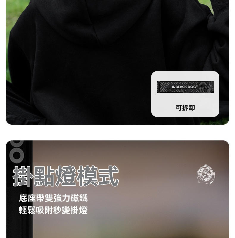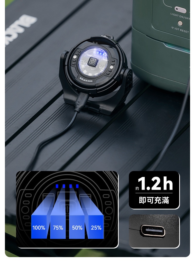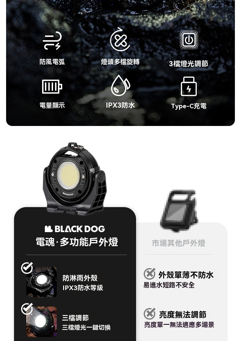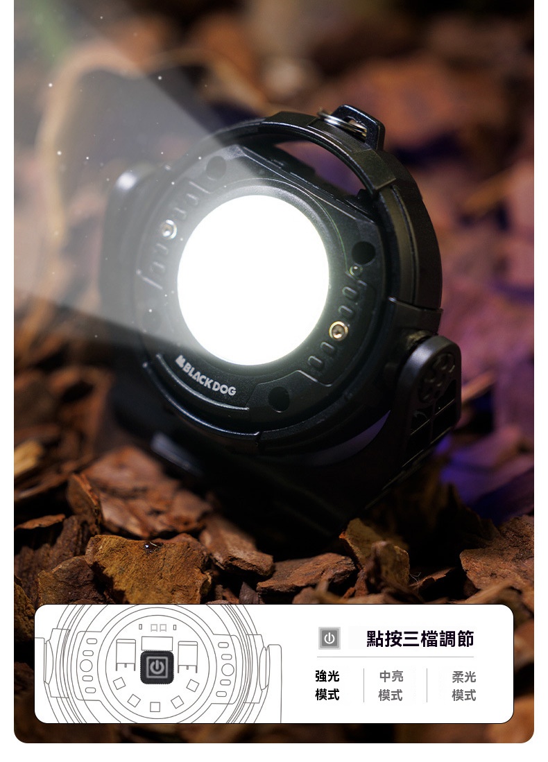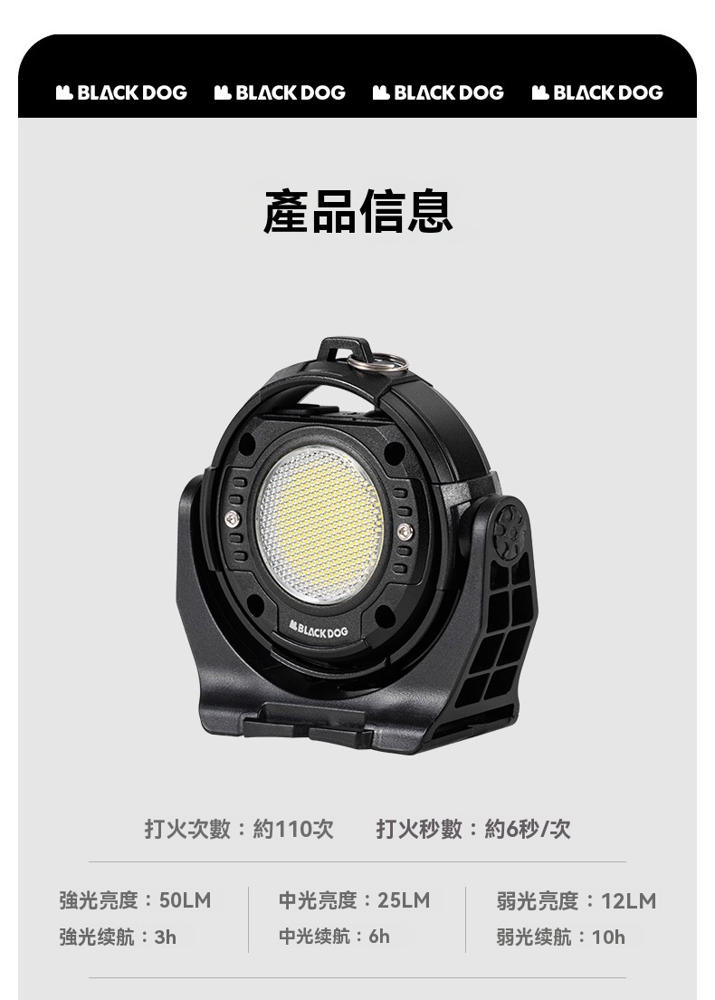 BLACKDOG 電魂多功能戶外燈(CBD2450ZM012),以沉穩黑色彰顯質感。其最大亮點是自備點火裝置,野外生火一鍵搞定,方便又安全。它擁有 多檔旋轉燈頭,多種角度隨意切換,且三檔燈光調節,適應多種需光環境。大容量鋰電池保障長續航,讓你擺脫電量焦慮。一體成型耐磨抗摔機身,達到 IPX3級防潑水,無懼惡劣環境。底部強磁設計,輕鬆吸附金屬物,釋放雙手。露營、健行、釣魚等場景,它都是你貼心又得力的戶外好幫手。