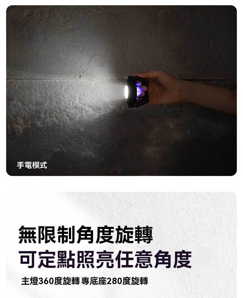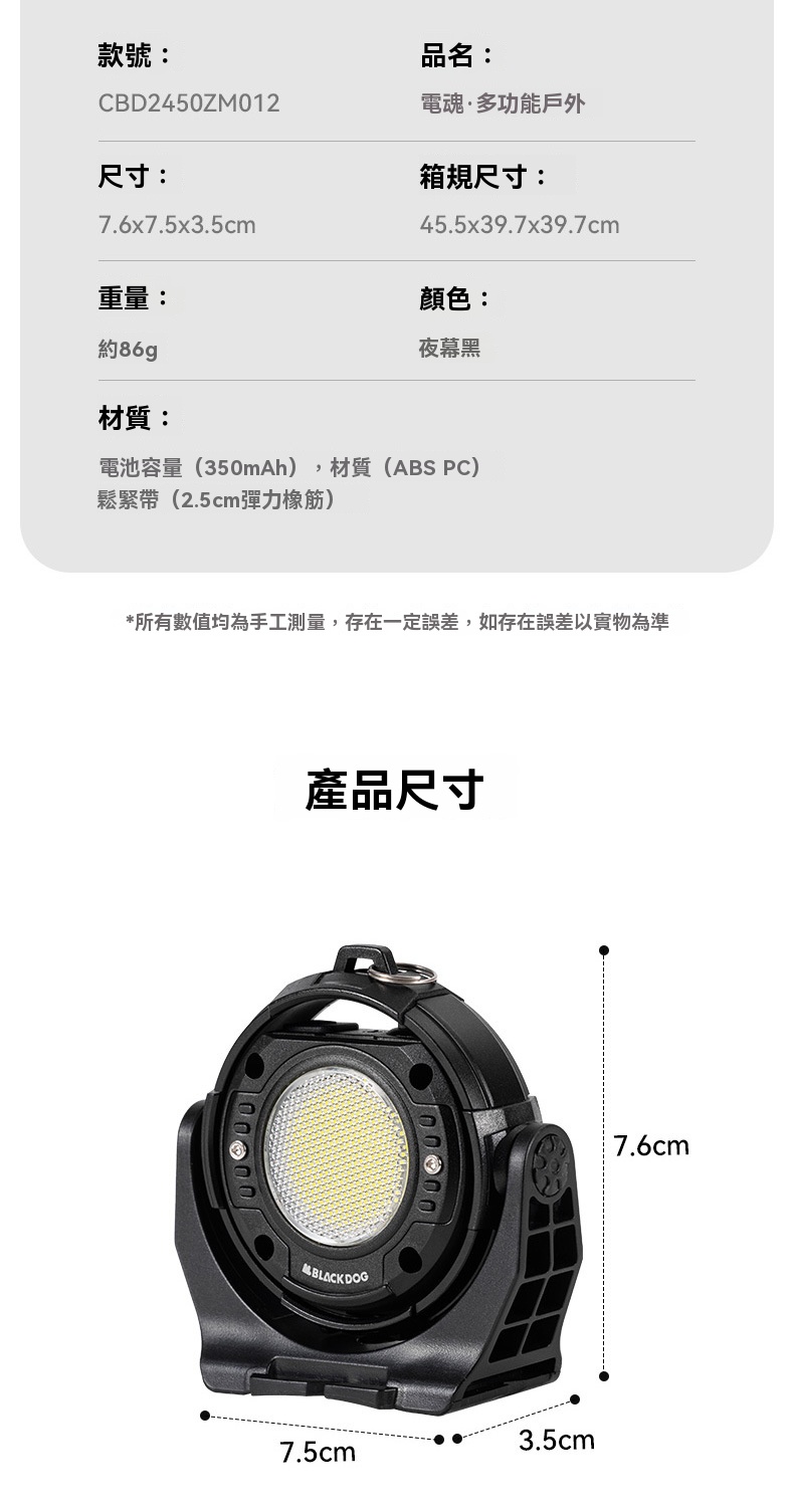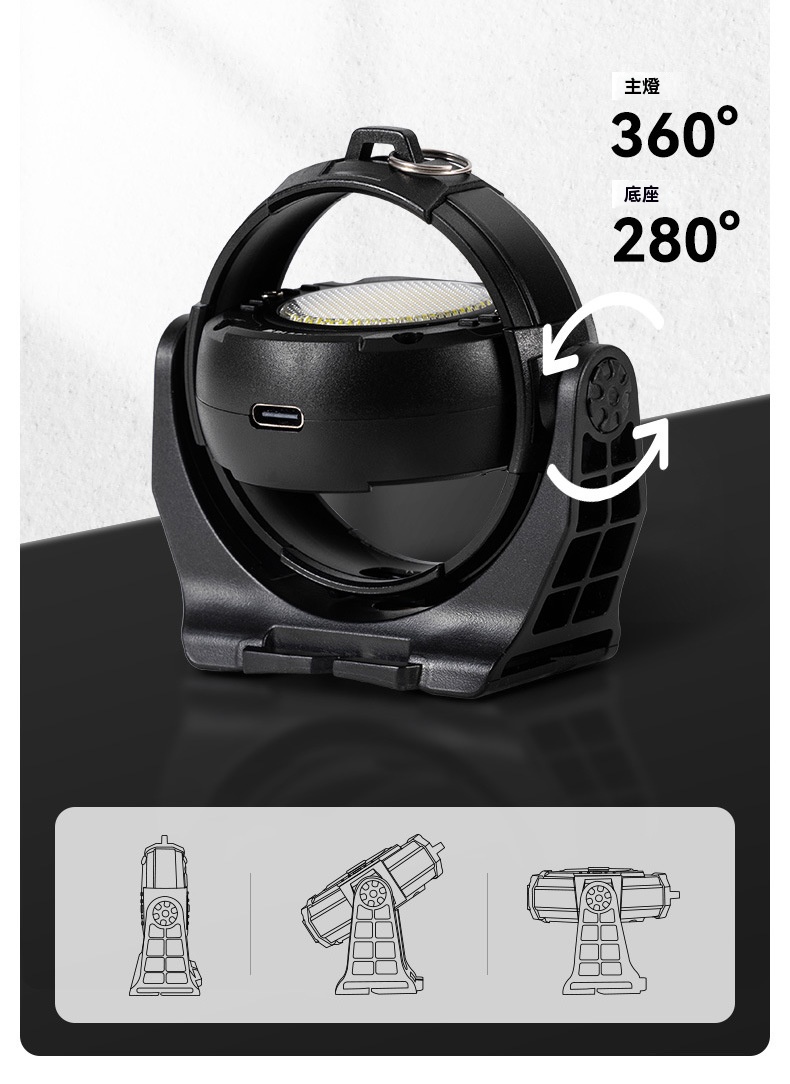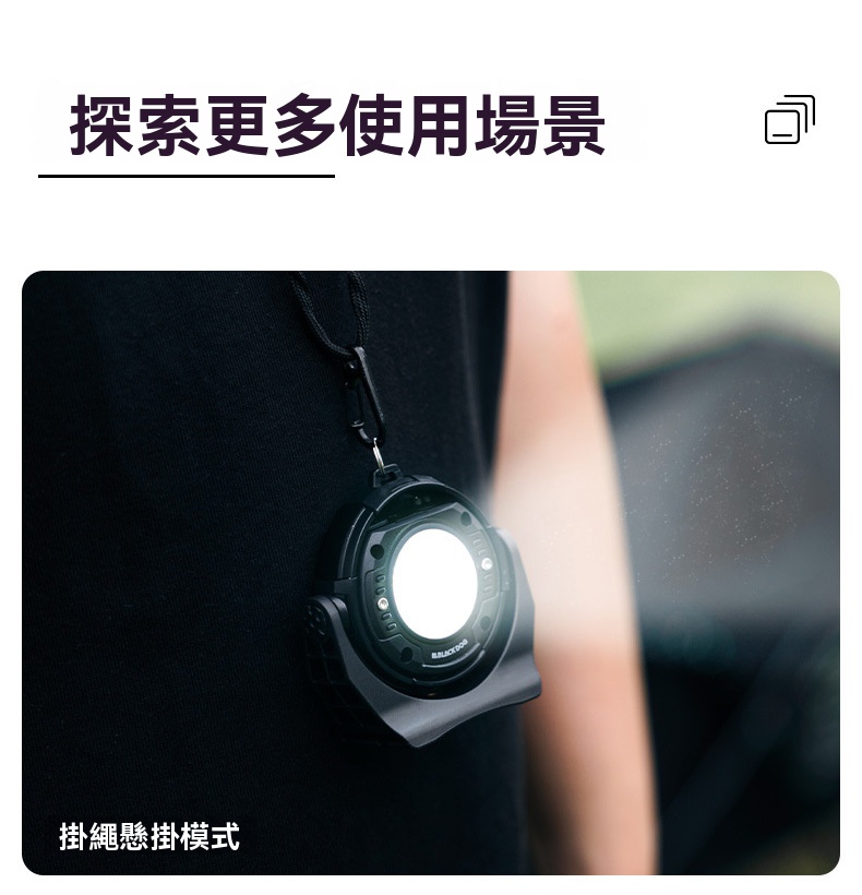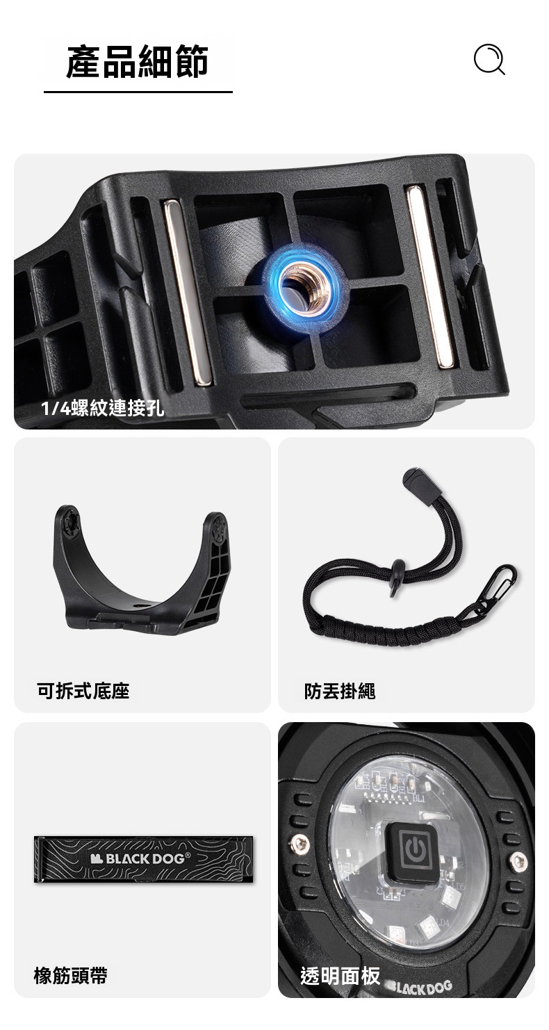 BLACKDOG 電魂多功能戶外燈(CBD2450ZM012),以沉穩黑色彰顯質感。其最大亮點是自備點火裝置,野外生火一鍵搞定,方便又安全。它擁有 多檔旋轉燈頭,多種角度隨意切換,且三檔燈光調節,適應多種需光環境。大容量鋰電池保障長續航,讓你擺脫電量焦慮。一體成型耐磨抗摔機身,達到 IPX3級防潑水,無懼惡劣環境。底部強磁設計,輕鬆吸附金屬物,釋放雙手。露營、健行、釣魚等場景,它都是你貼心又得力的戶外好幫手。
